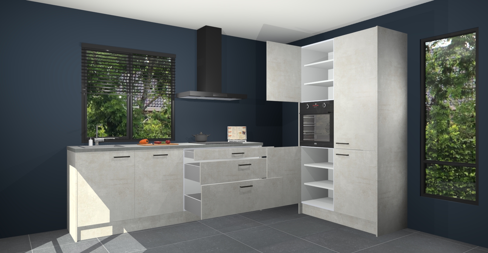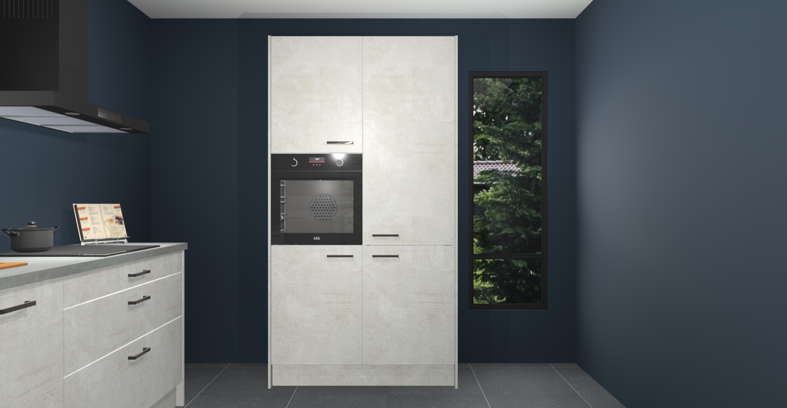 De setting is compleet gemaakt door de vijf inbouwapparaten: wanneer u gaat bestellen kunt u upgraden naar AEG-apparaten als oven, inductieplaat, afzuigkap, vaatwasser en koelkast. Kiest u voor onze Beton opaal keuken Monaco, dan weet u zeker dat u te maken heeft met Duitse kwaliteit. Bovendien is er altijd sprake van een lage prijs en profiteren we aantrekkelijk leveringstermijn: die bedraagt slechts 7 weken ! Om het extra makkelijk te maken worden de keukenkasten reeds voorgemonteerd geleverd.