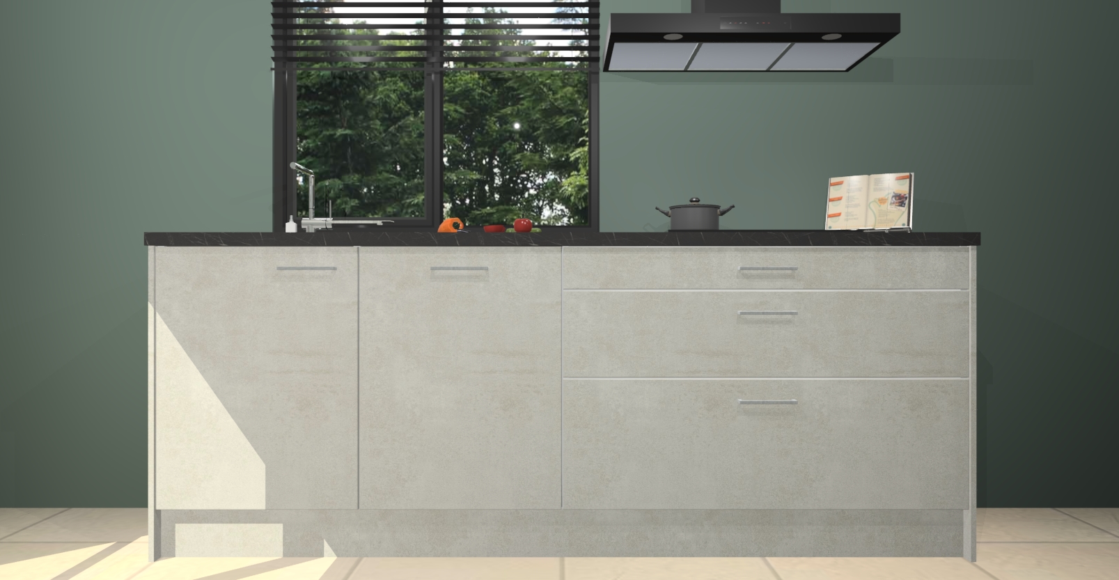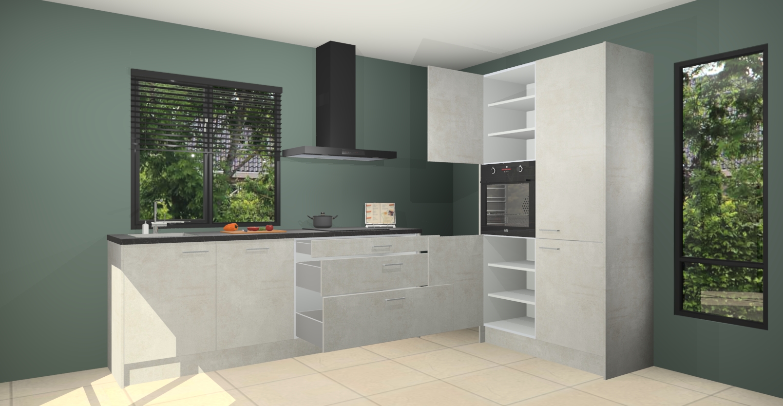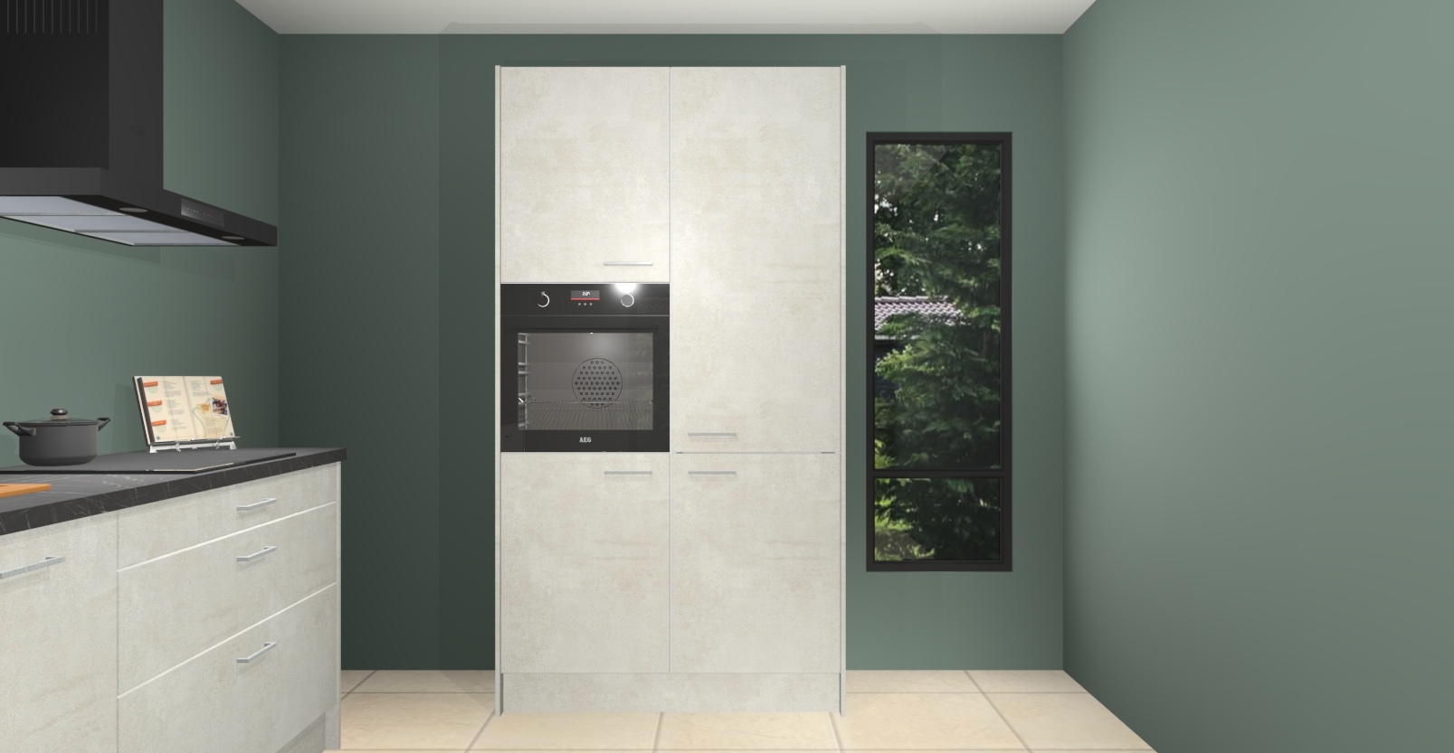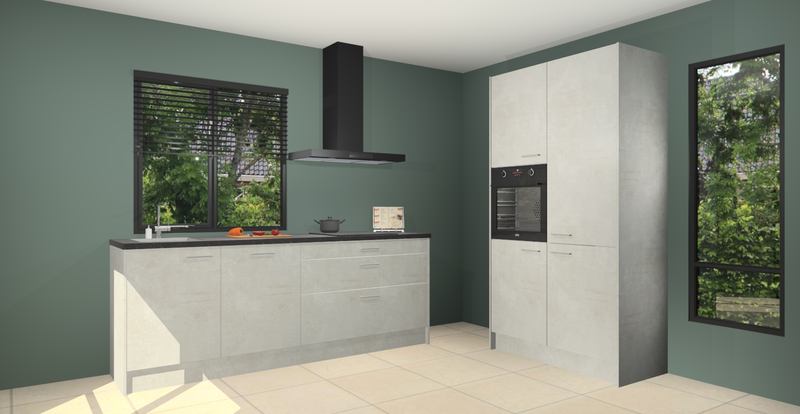 De setting is compleet gemaakt door de vijf inbouwapparaten: wanneer u gaat bestellen kunt u upgraden naar AEG-apparaten als oven, inductieplaat, afzuigkap, vaatwasser en koelkast. Kiest u voor onze Beton opaal keuken Monaco, dan weet u zeker dat u te maken heeft met Duitse kwaliteit. Bovendien is er altijd sprake van een lage prijs en profiteren we aantrekkelijk leveringstermijn: die bedraagt slechts 7 weken ! Om het extra makkelijk te maken worden de keukenkasten reeds voorgemonteerd geleverd.