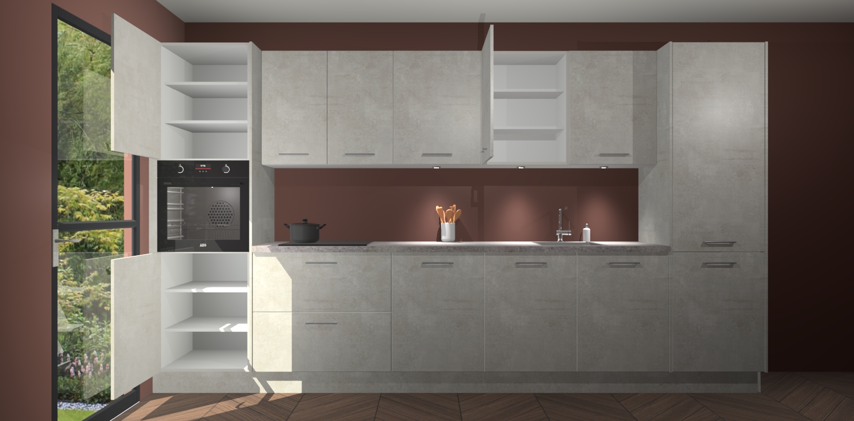 Dit is de perfecte keuken voor wie op zoek is naar een luxueuze stijl zonder zijn portemonnee te legen! Het chique ontwerp van de beton opaal keuken Wels voegt dat vleugje verfijning toe aan elk huis. Het gemak van voorgemonteerde kasten bespaart u talloze uren tijd en energie, zodat u veel sneller dan verwacht kunt beginnen te genieten van uw prachtige nieuwe keuken. Bovendien bedraagt de levertijd slechts 7 weken.
