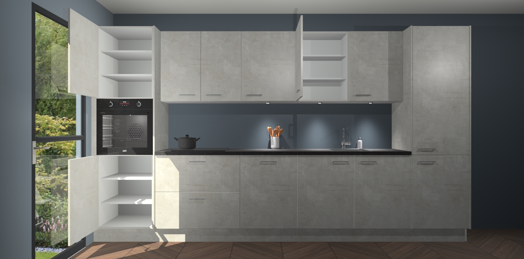 Dit is de perfecte keuken voor wie op zoek is naar een luxueuze stijl zonder zijn portemonnee te legen! Het chique ontwerp van de beton opaal keuken Wels voegt dat vleugje verfijning toe aan elk huis. Het gemak van voorgemonteerde kasten bespaart u talloze uren tijd en energie, zodat u veel sneller dan verwacht kunt beginnen te genieten van uw prachtige nieuwe keuken. Bovendien bedraagt de levertijd slechts 7 weken.