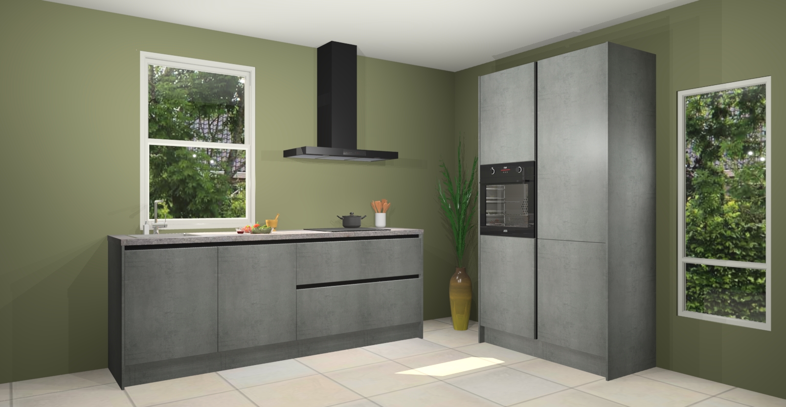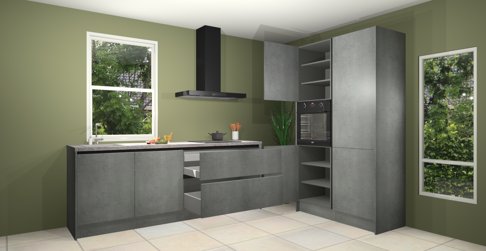 De Beton parelgrijs greeploze keuken Monaco heeft voldoende opbergruimte om uw keukenbenodigdheden georganiseerd en netjes te houden. Geniet van het gemak van de soft-close deuren, die deze stijlvolle look perfect afmaken. Maar dat is nog niet alles. Met de Beton parelgrijs greeploze keuken Monaco krijgt u maar liefst 5 ingebouwde apparaten: een oven, inductiekookplaat, afzuigkap, vaatwasser en koelkast. Deze kunnen gemakkelijk worden geüpgraded naar AEG als ze besteld zijn.