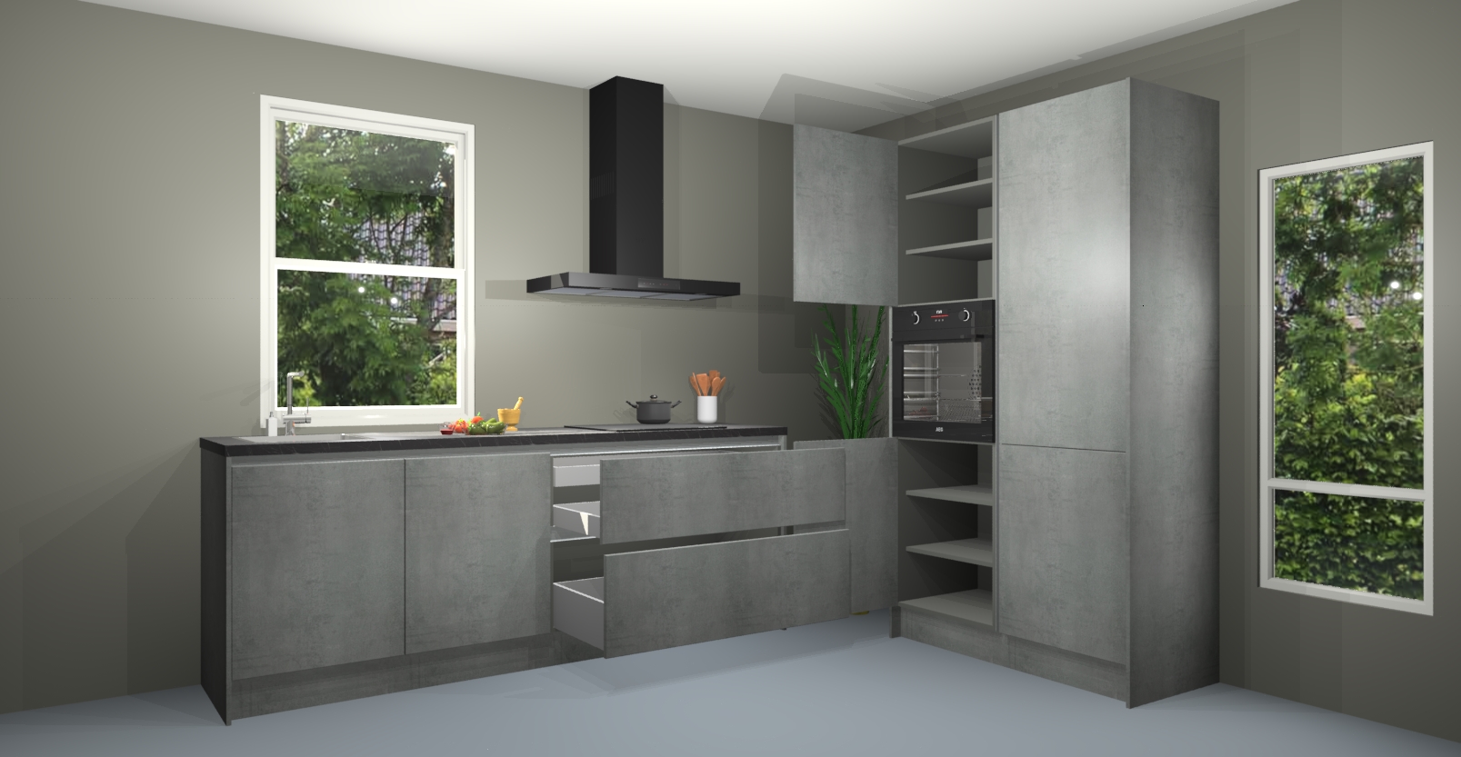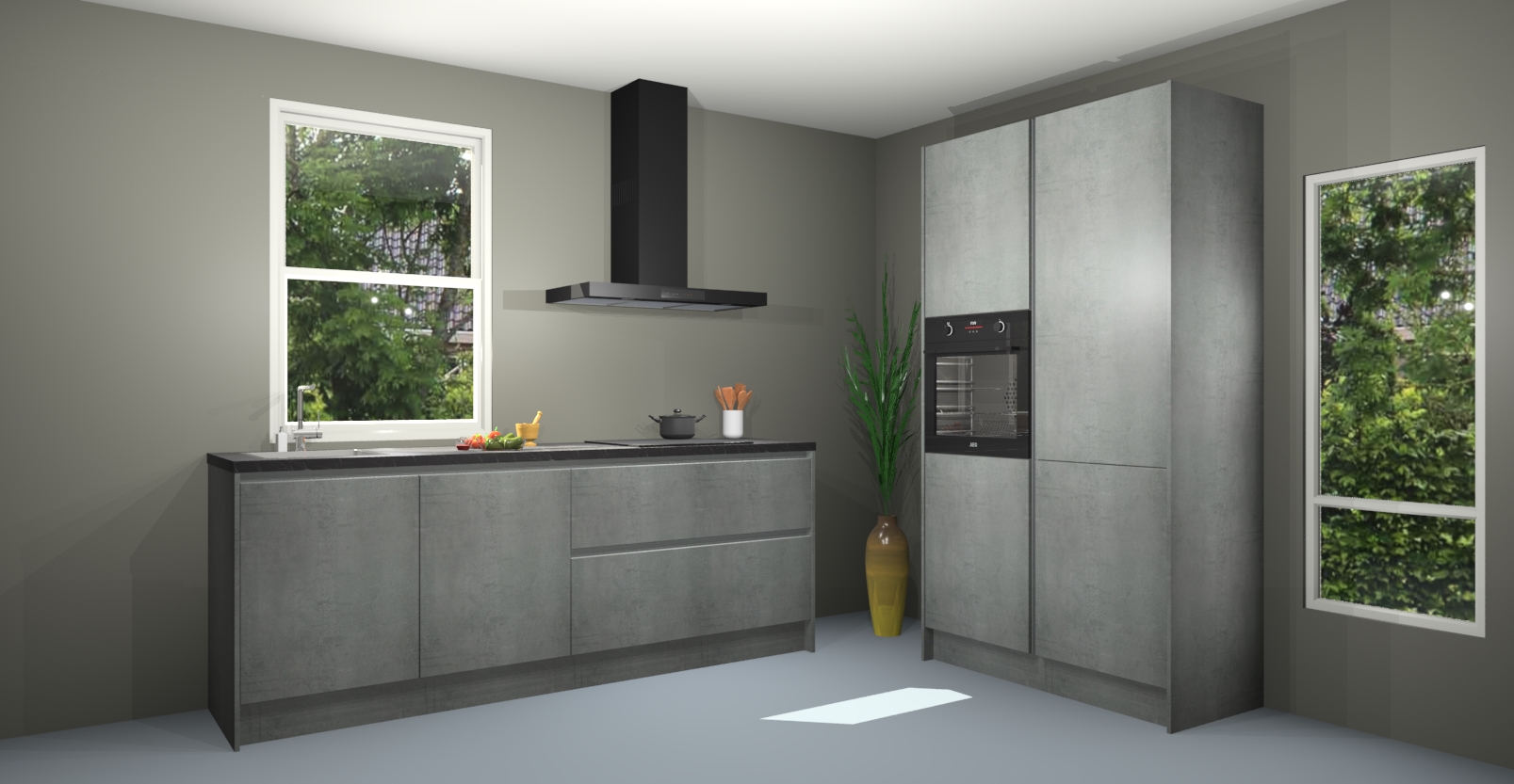 De Beton parelgrijs greeploze keuken Monaco heeft voldoende opbergruimte om uw keukenbenodigdheden georganiseerd en netjes te houden. Geniet van het gemak van de soft-close deuren, die deze stijlvolle look perfect afmaken. Maar dat is nog niet alles. Met de Beton parelgrijs greeploze keuken Monaco krijgt u maar liefst 5 ingebouwde apparaten: een oven, inductiekookplaat, afzuigkap, vaatwasser en koelkast. Deze kunnen gemakkelijk worden geüpgraded naar AEG als ze besteld zijn.