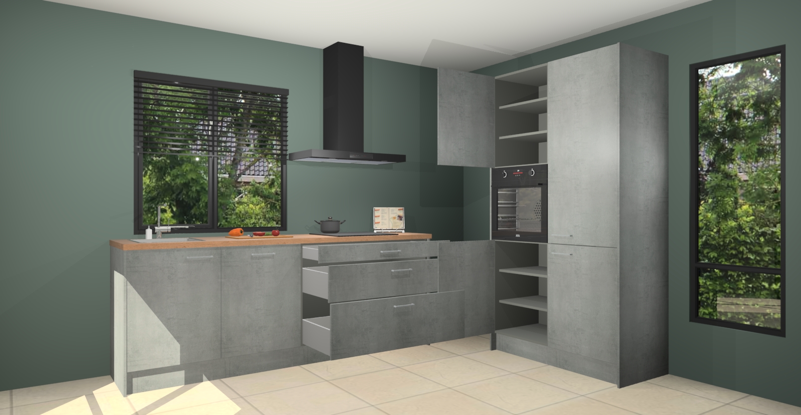 De setting is compleet gemaakt door de vijf inbouwapparaten: wanneer u gaat bestellen kunt u upgraden naar AEG-apparaten als oven, inductieplaat, afzuigkap, vaatwasser en koelkast. Kiest u voor onze Beton parelgrijs keuken Monaco, dan weet u zeker dat u te maken heeft met Duitse kwaliteit. Bovendien is er altijd sprake van een lage prijs en profiteren we aantrekkelijk leveringstermijn: die bedraagt slechts 7 weken ! Om het extra makkelijk te maken worden de keukenkasten reeds voorgemonteerd geleverd.
