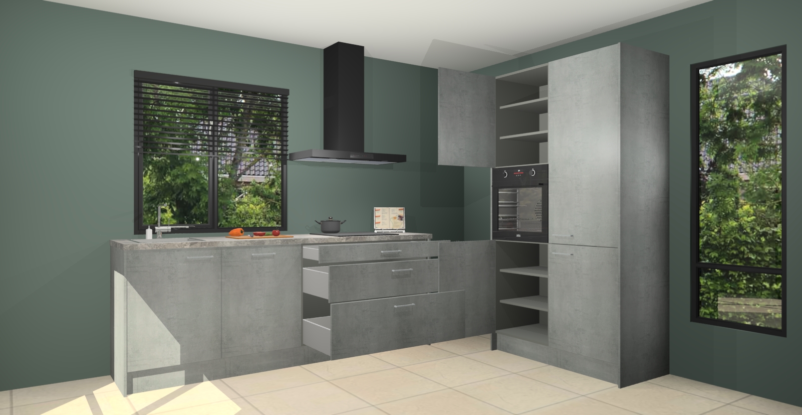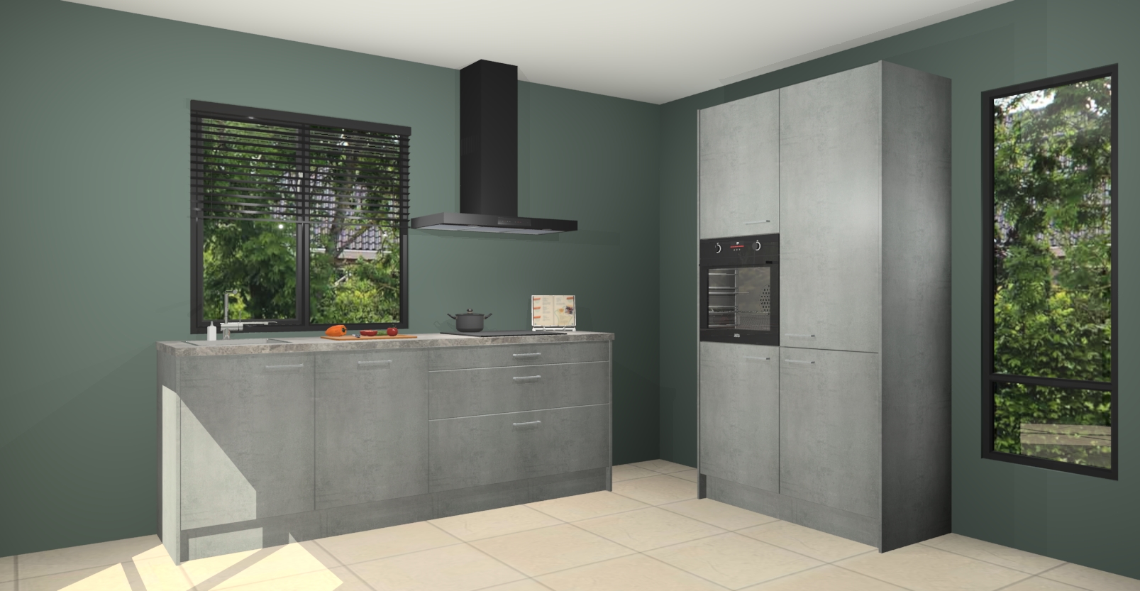 De setting is compleet gemaakt door de vijf inbouwapparaten: wanneer u gaat bestellen kunt u upgraden naar AEG-apparaten als oven, inductieplaat, afzuigkap, vaatwasser en koelkast. Kiest u voor onze Beton parelgrijs keuken Monaco, dan weet u zeker dat u te maken heeft met Duitse kwaliteit. Bovendien is er altijd sprake van een lage prijs en profiteren we aantrekkelijk leveringstermijn: die bedraagt slechts 7 weken ! Om het extra makkelijk te maken worden de keukenkasten reeds voorgemonteerd geleverd.