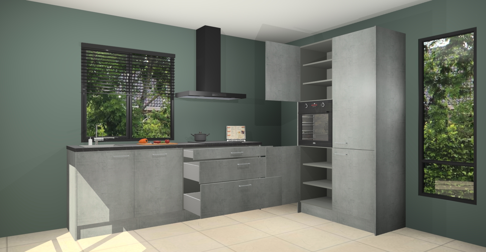 De setting is compleet gemaakt door de vijf inbouwapparaten: wanneer u gaat bestellen kunt u upgraden naar AEG-apparaten als oven, inductieplaat, afzuigkap, vaatwasser en koelkast. Kiest u voor onze Beton parelgrijs keuken Monaco, dan weet u zeker dat u te maken heeft met Duitse kwaliteit. Bovendien is er altijd sprake van een lage prijs en profiteren we aantrekkelijk leveringstermijn: die bedraagt slechts 7 weken ! Om het extra makkelijk te maken worden de keukenkasten reeds voorgemonteerd geleverd.