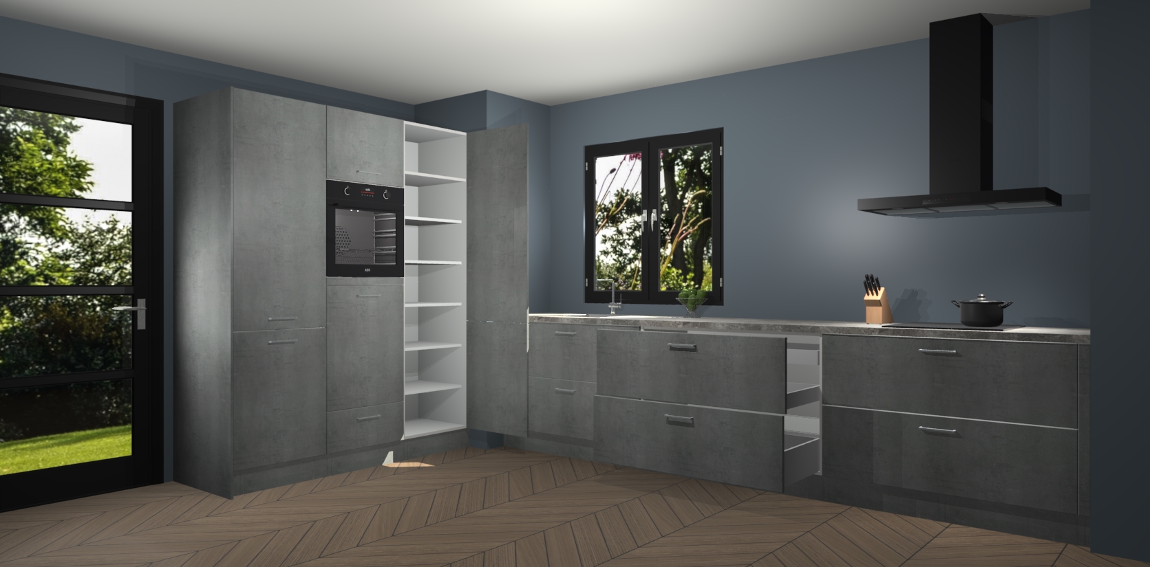De softclose deuren openen en sluiten is ook heel eenvoudig - geniet van een moeiteloze keukenervaring, zelfs als er kinderen rondlopen. Voor extra gemak bij het plaatsen van uw bestelling bieden we ook een upgrade naar een kookplaat met geïntegreerde afzuiging.