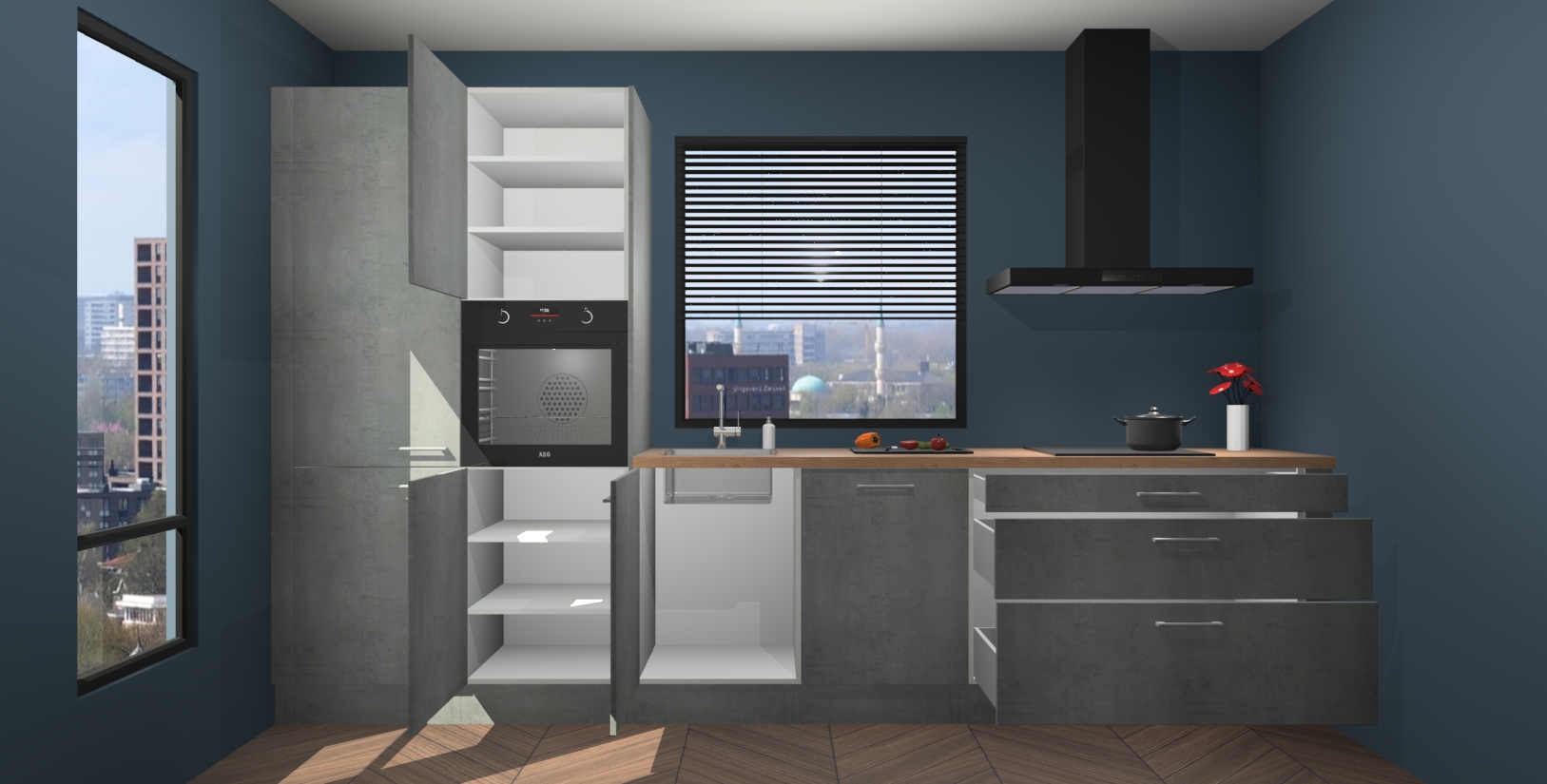 Met 5 geïntegreerde apparaten - oven, inductiekookplaat, afzuigkap, vaatwasser en koelkast - zorgt deze prachtige opstelling ervoor dat u alle benodigdheden hebt om uw favoriete gerechten te bereiden. Ze zijn voorzien van softclose deuren zodat u ze moeiteloos kunt openen en sluiten zonder schuren of lawaai.