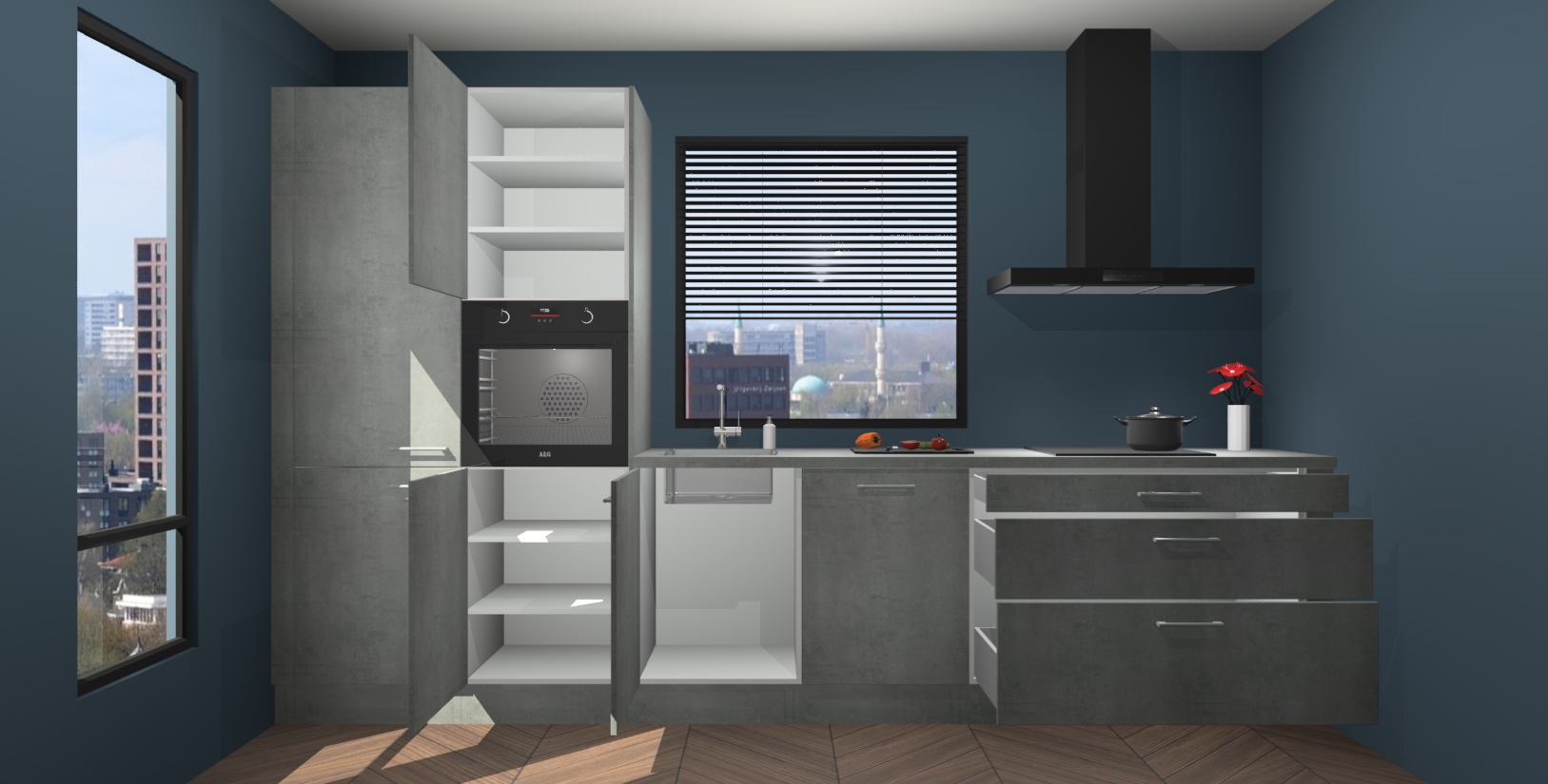 Met 5 geïntegreerde apparaten - oven, inductiekookplaat, afzuigkap, vaatwasser en koelkast - zorgt deze prachtige opstelling ervoor dat u alle benodigdheden hebt om uw favoriete gerechten te bereiden. Ze zijn voorzien van softclose deuren zodat u ze moeiteloos kunt openen en sluiten zonder schuren of lawaai.