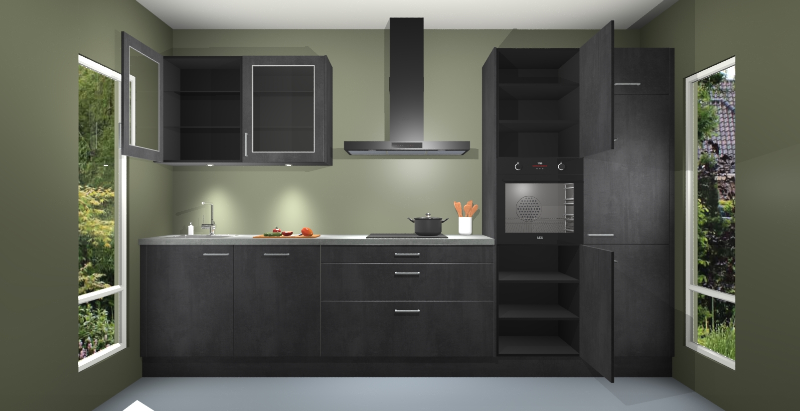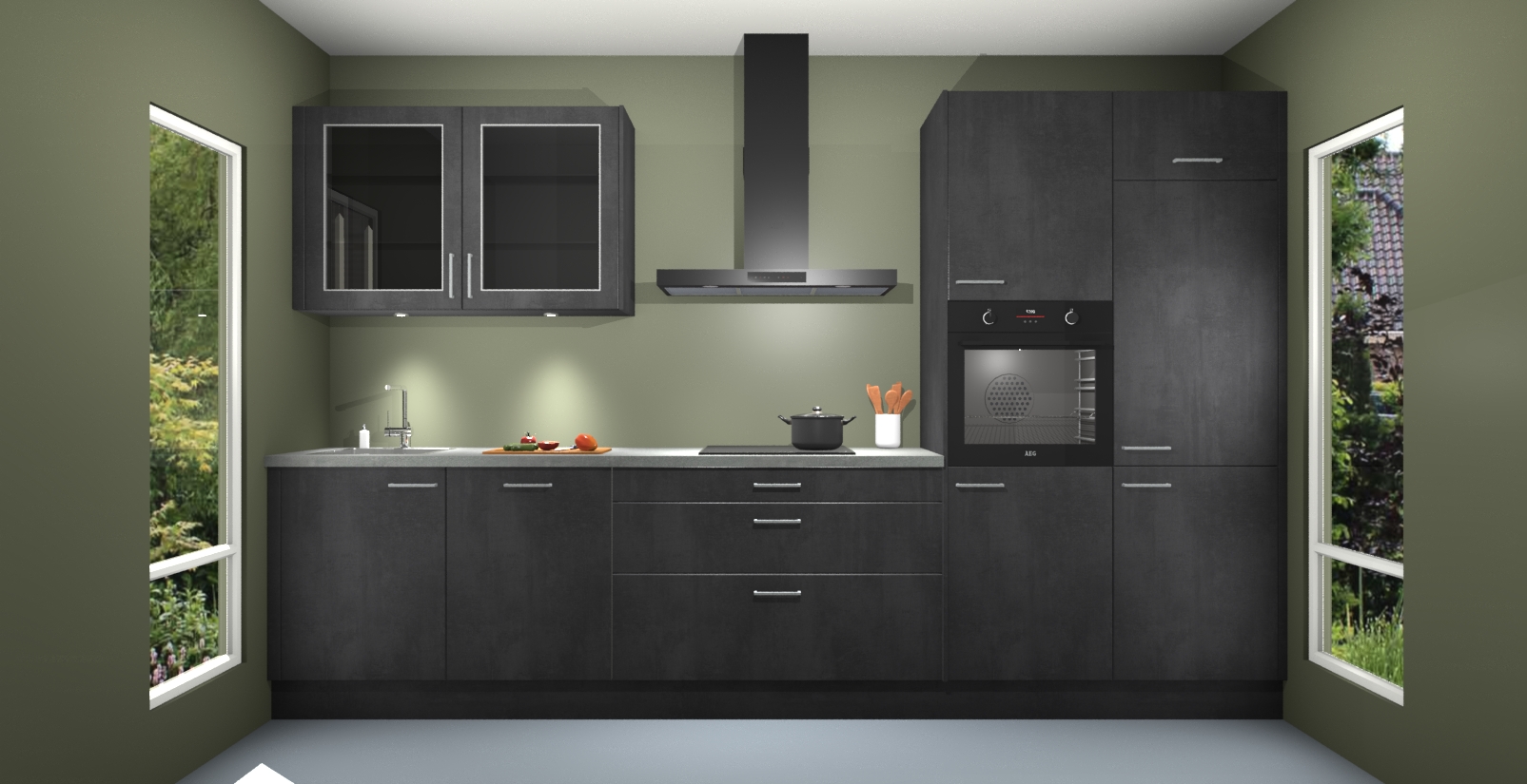 De beton zwart keuken Cairo is de perfecte mix van modern en tijdloos design. Met zijn prachtige glazen deuren op de bovenkastjes voegt hij echt iets speciaals en unieks toe aan elke keuken. En met vijf ingebouwde apparaten inbegrepen - een oven, inductiekookplaat, afzuigkap, vaatwasser en koelkast - kunt u deze keuken echt helemaal van uzelf maken! U kunt na bestelling ook upgraden naar AEG voor een nog hogere kwaliteitservaring.