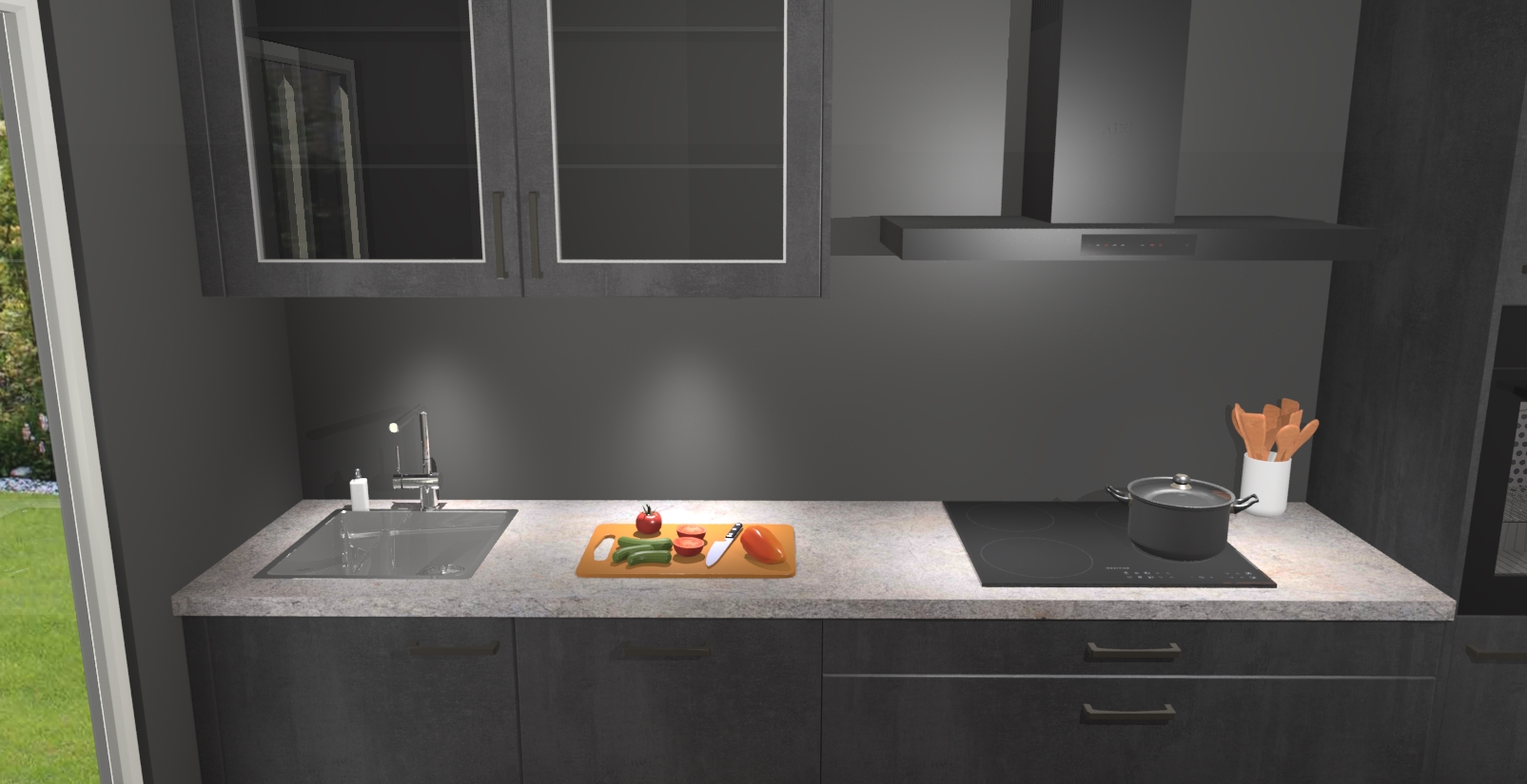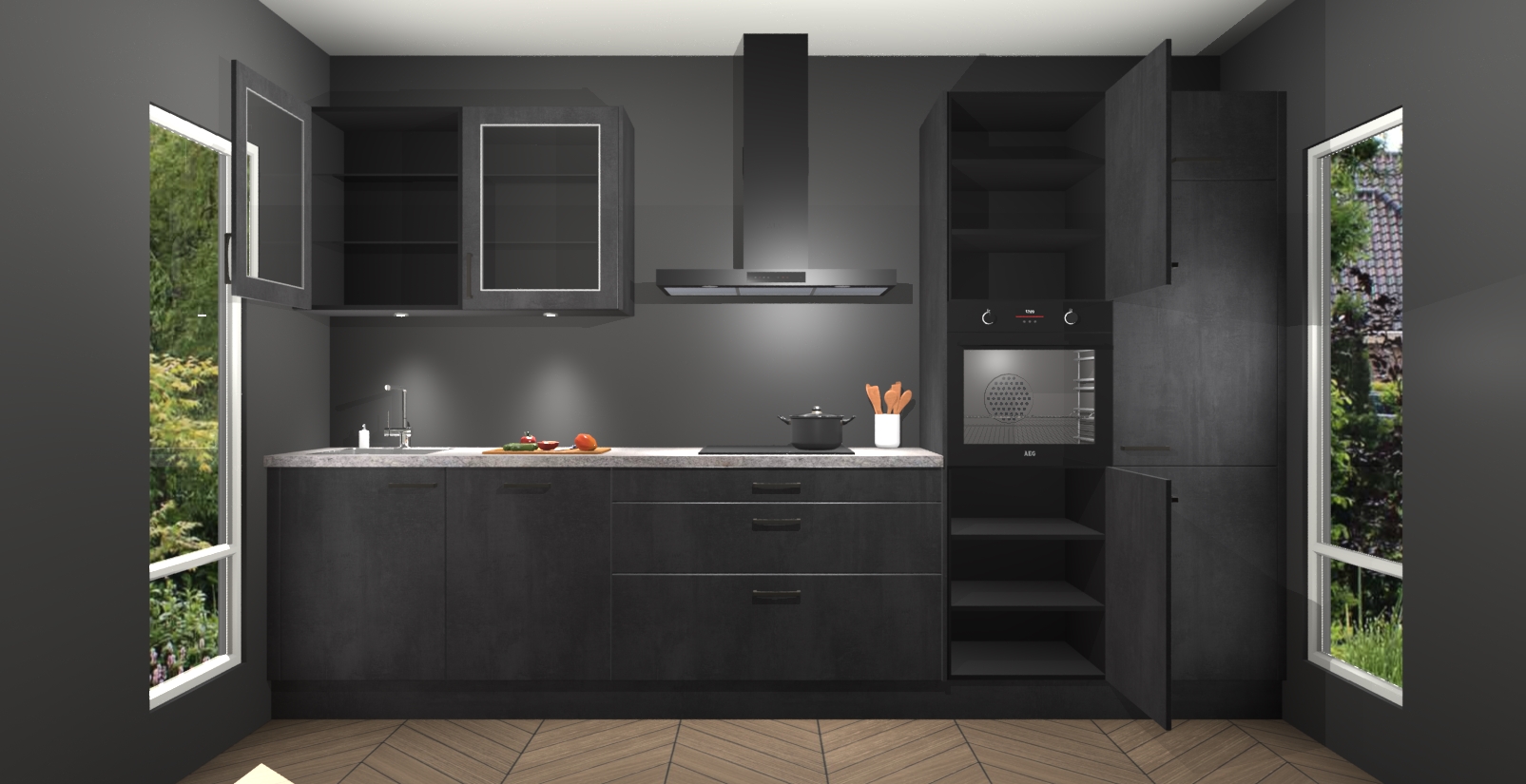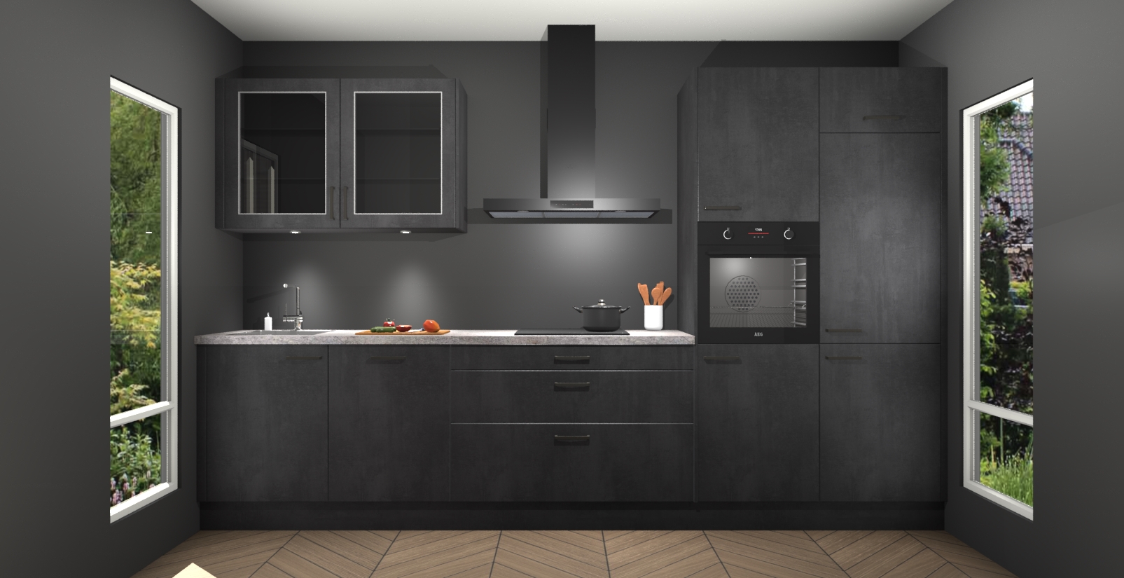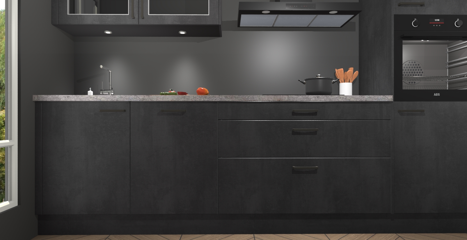De beton zwart keuken Cairo is de perfecte mix van modern en tijdloos design. Met zijn prachtige glazen deuren op de bovenkastjes voegt hij echt iets speciaals en unieks toe aan elke keuken. En met vijf ingebouwde apparaten inbegrepen - een oven, inductiekookplaat, afzuigkap, vaatwasser en koelkast - kunt u deze keuken echt helemaal van uzelf maken! U kunt na bestelling ook upgraden naar AEG voor een nog hogere kwaliteitservaring.