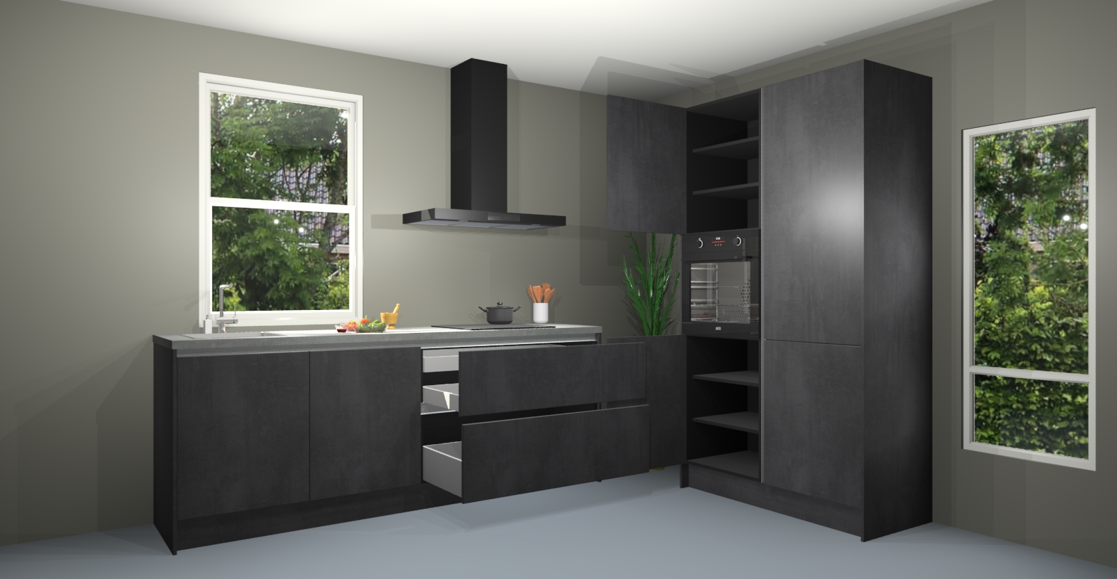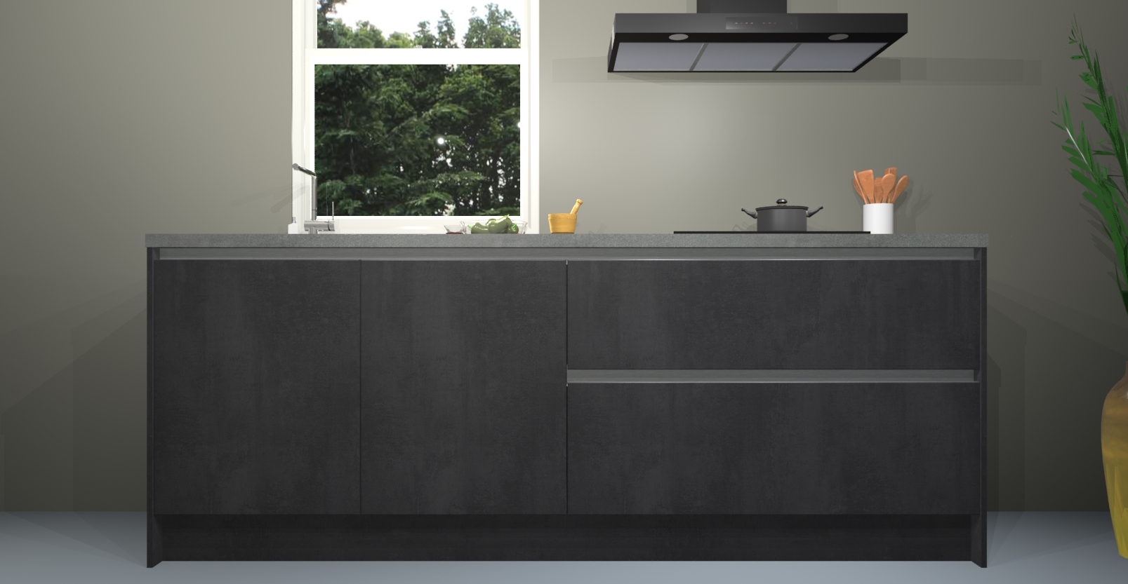 De Beton zwarte greeploze keuken Monaco heeft voldoende opbergruimte om uw keukenbenodigdheden georganiseerd en netjes te houden. Geniet van het gemak van de soft-close deuren, die deze stijlvolle look perfect afmaken. Maar dat is nog niet alles. Met de Beton zwarte greeploze keuken Monaco krijgt u maar liefst 5 ingebouwde apparaten: een oven, inductiekookplaat, afzuigkap, vaatwasser en koelkast. Deze kunnen gemakkelijk worden geüpgraded naar AEG als ze besteld zijn.