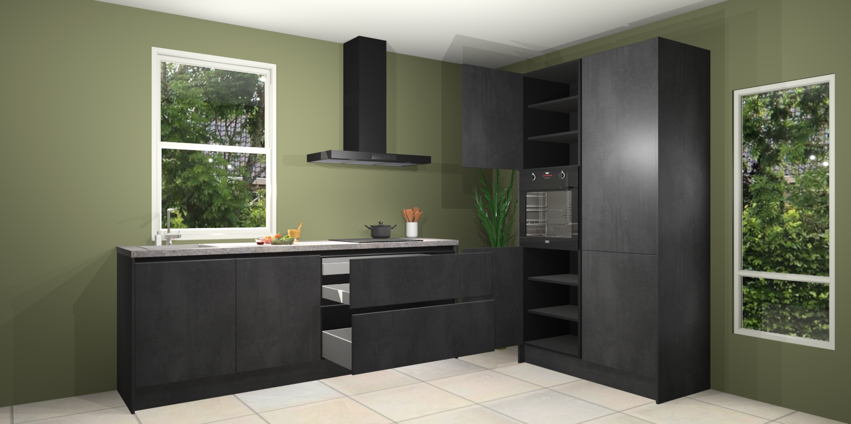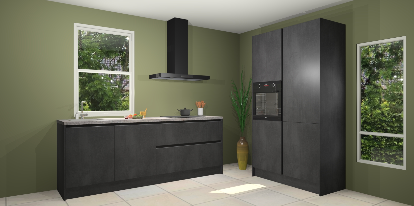 De Beton zwarte greeploze keuken Monaco heeft voldoende opbergruimte om uw keukenbenodigdheden georganiseerd en netjes te houden. Geniet van het gemak van de soft-close deuren, die deze stijlvolle look perfect afmaken. Maar dat is nog niet alles. Met de Beton zwarte greeploze keuken Monaco krijgt u maar liefst 5 ingebouwde apparaten: een oven, inductiekookplaat, afzuigkap, vaatwasser en koelkast. Deze kunnen gemakkelijk worden geüpgraded naar AEG als ze besteld zijn.