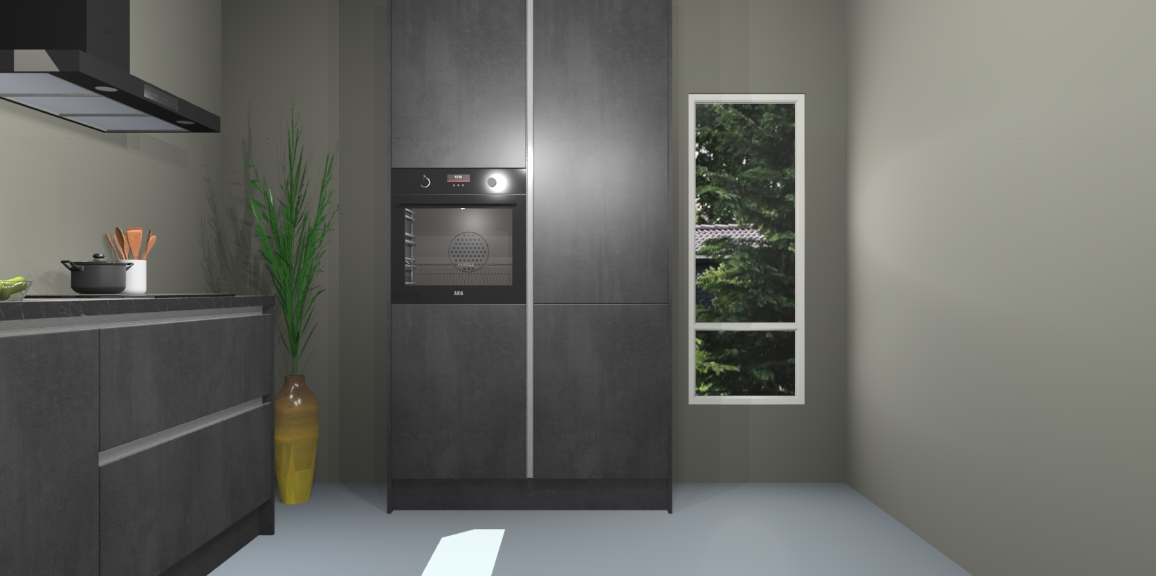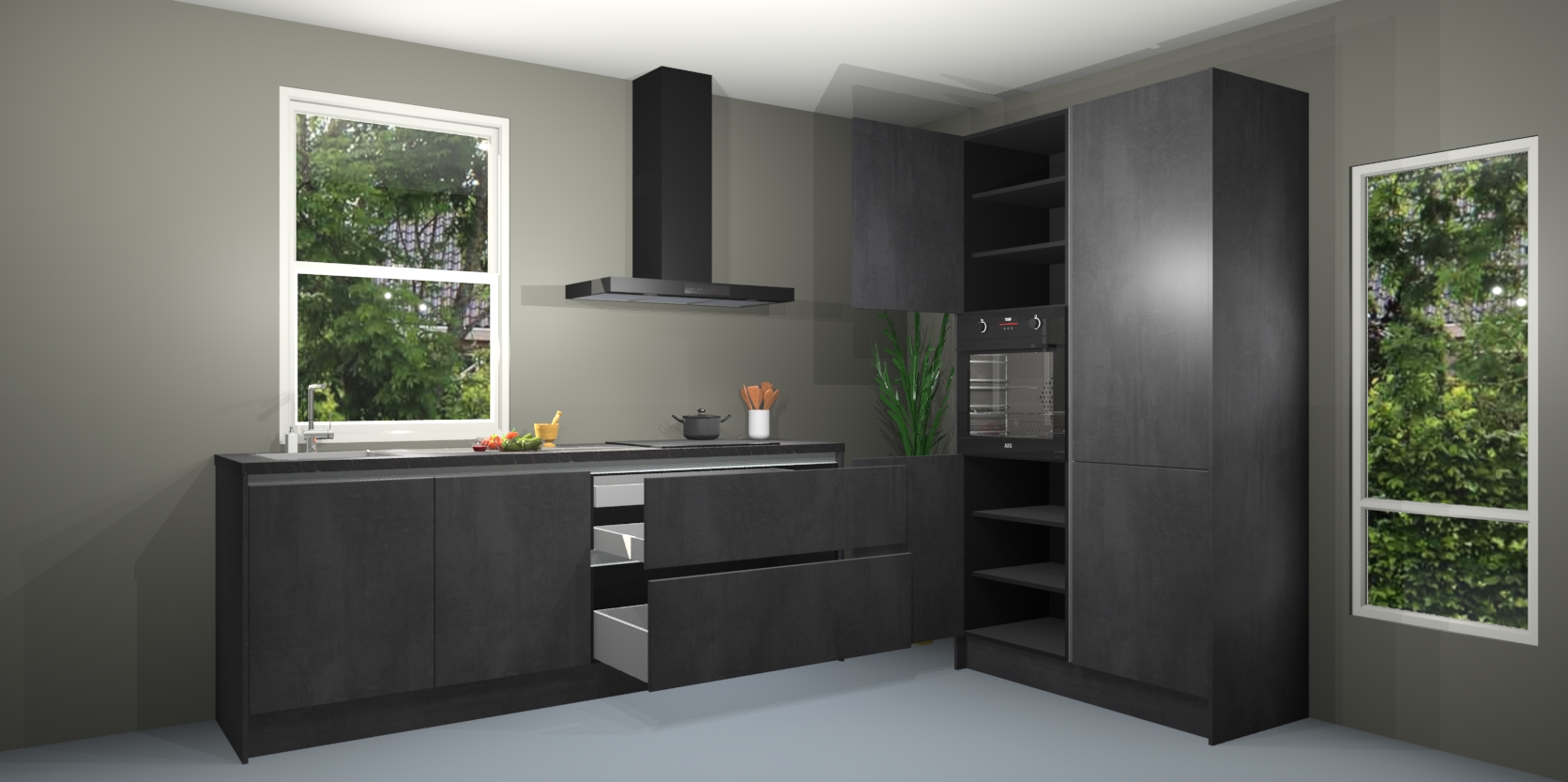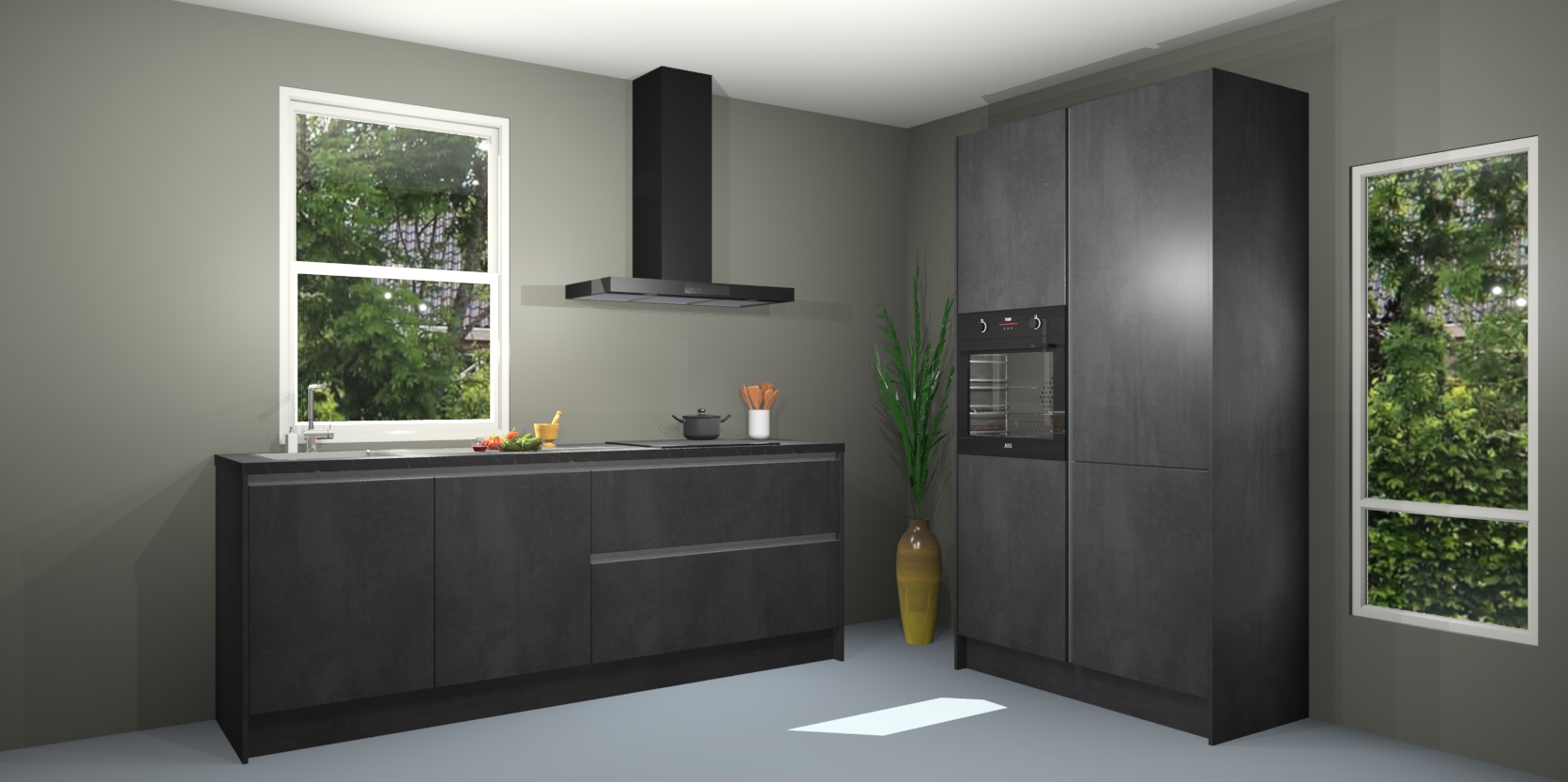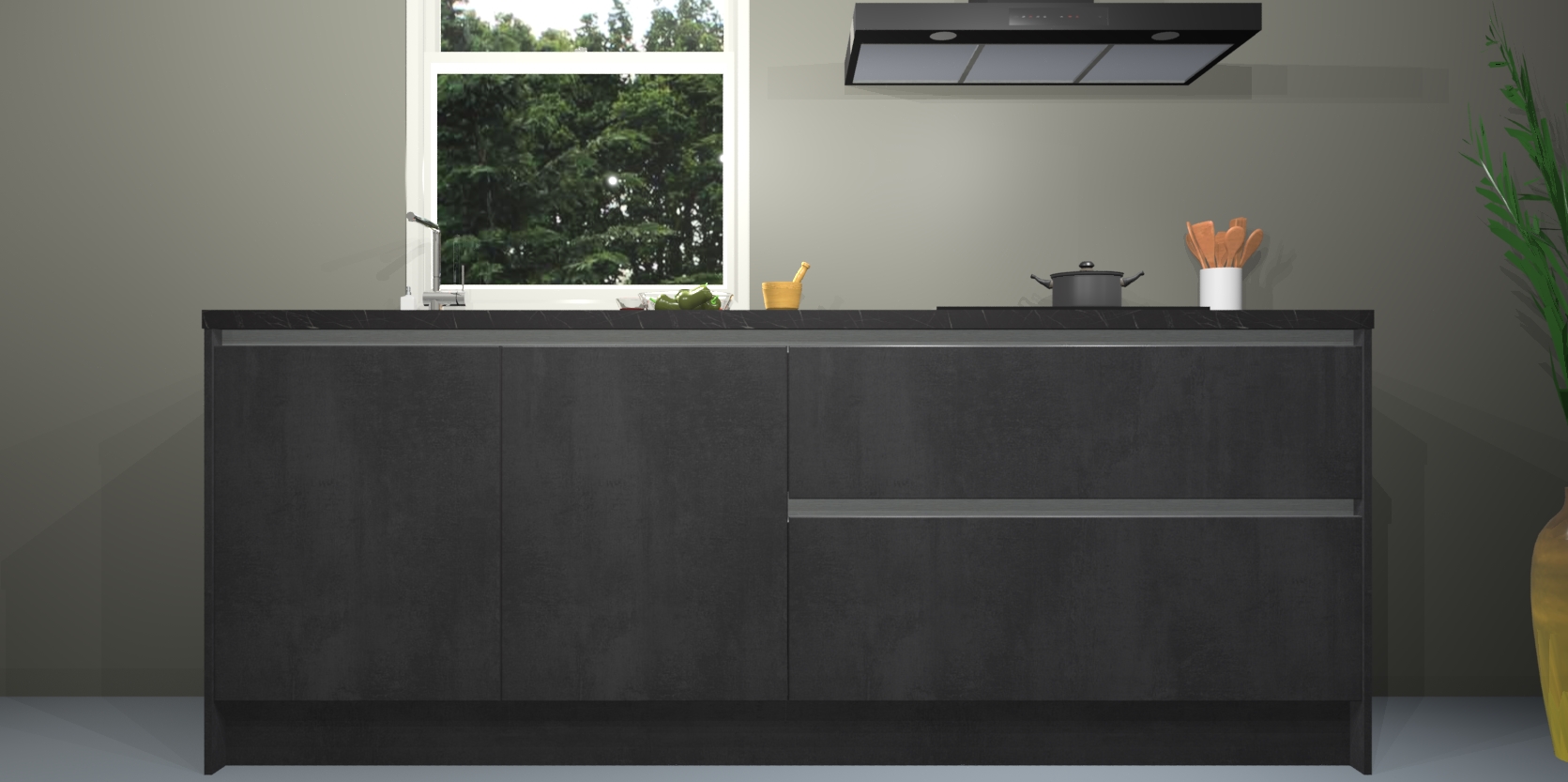 De Beton zwarte greeploze keuken Monaco heeft voldoende opbergruimte om uw keukenbenodigdheden georganiseerd en netjes te houden. Geniet van het gemak van de soft-close deuren, die deze stijlvolle look perfect afmaken. Maar dat is nog niet alles. Met de Beton zwarte greeploze keuken Monaco krijgt u maar liefst 5 ingebouwde apparaten: een oven, inductiekookplaat, afzuigkap, vaatwasser en koelkast. Deze kunnen gemakkelijk worden geüpgraded naar AEG als ze besteld zijn.