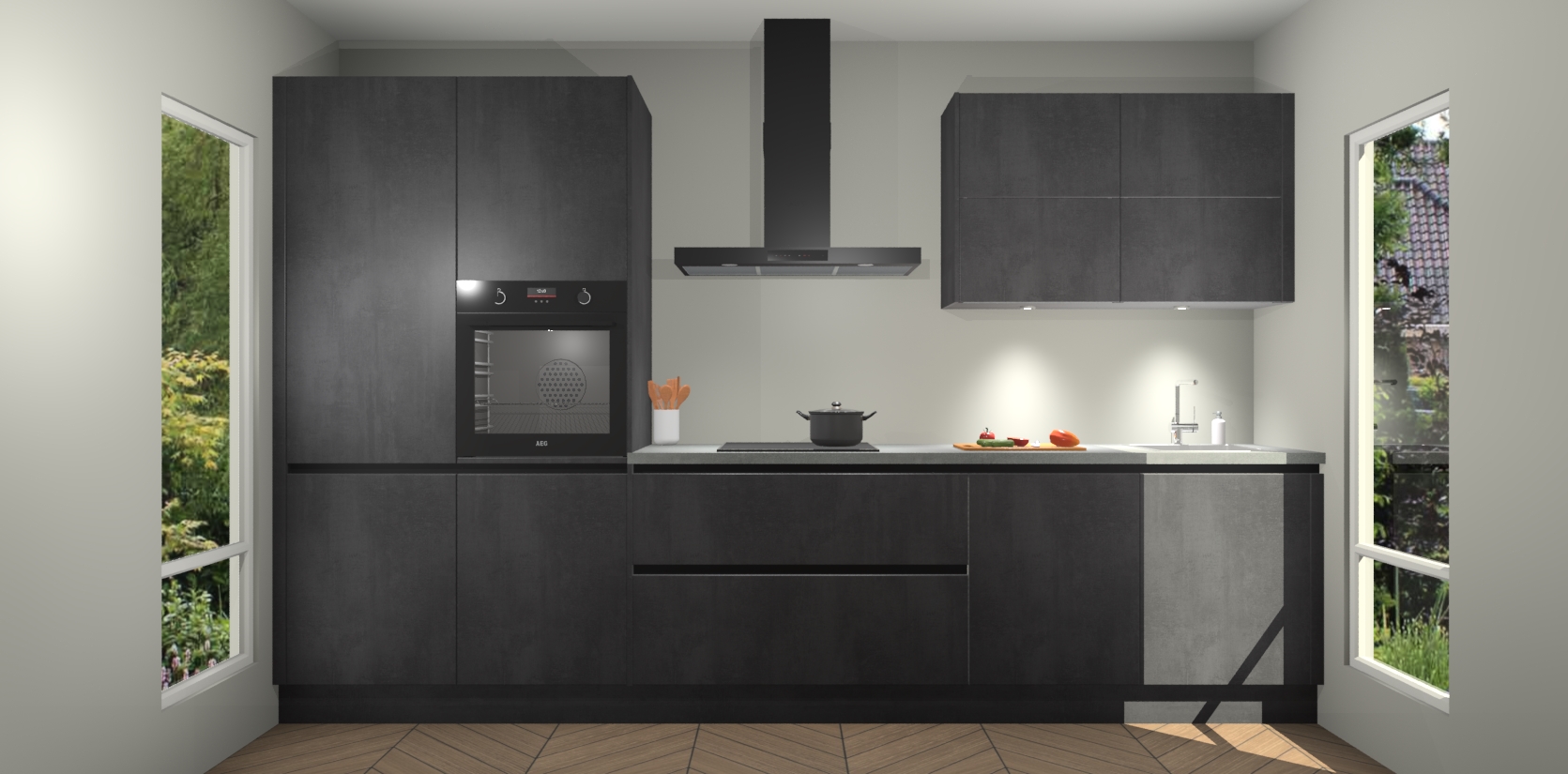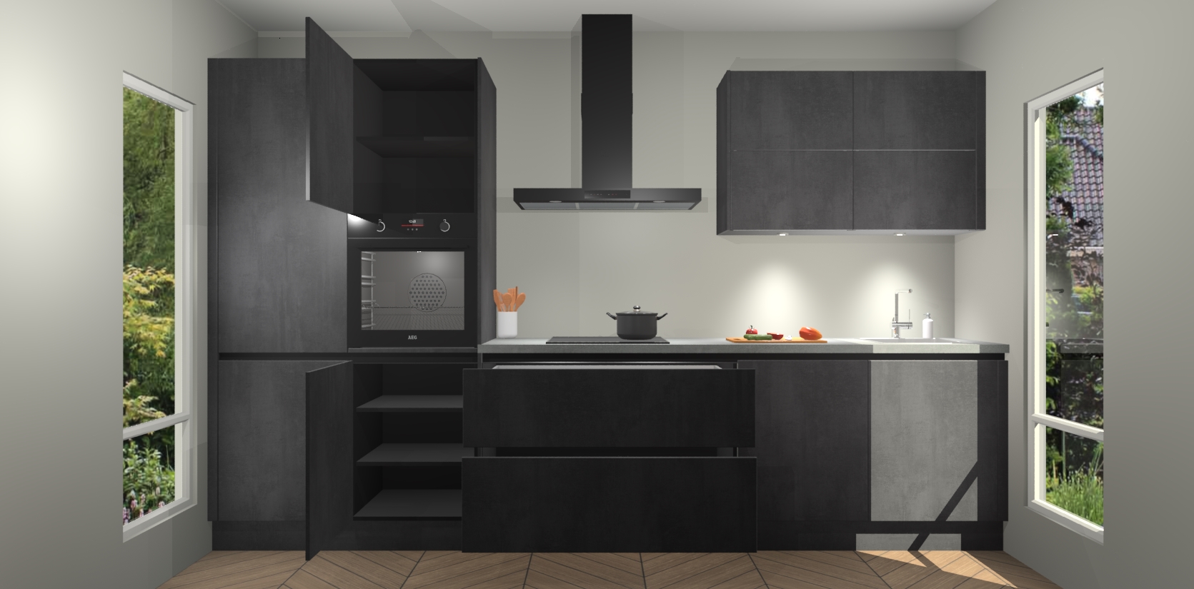 Maak kennis met de nieuwe Beton Zwarte greeploze Keuken Parijs - de perfecte designcombinatie van gemak, moderne elegantie en ultramodern design. Met een gemakkelijk te reinigen Beton Zwarte afwerking, zal de slankheid van deze keuken zeker een vleugje luxe toevoegen aan elke ruimte die hij inneemt.