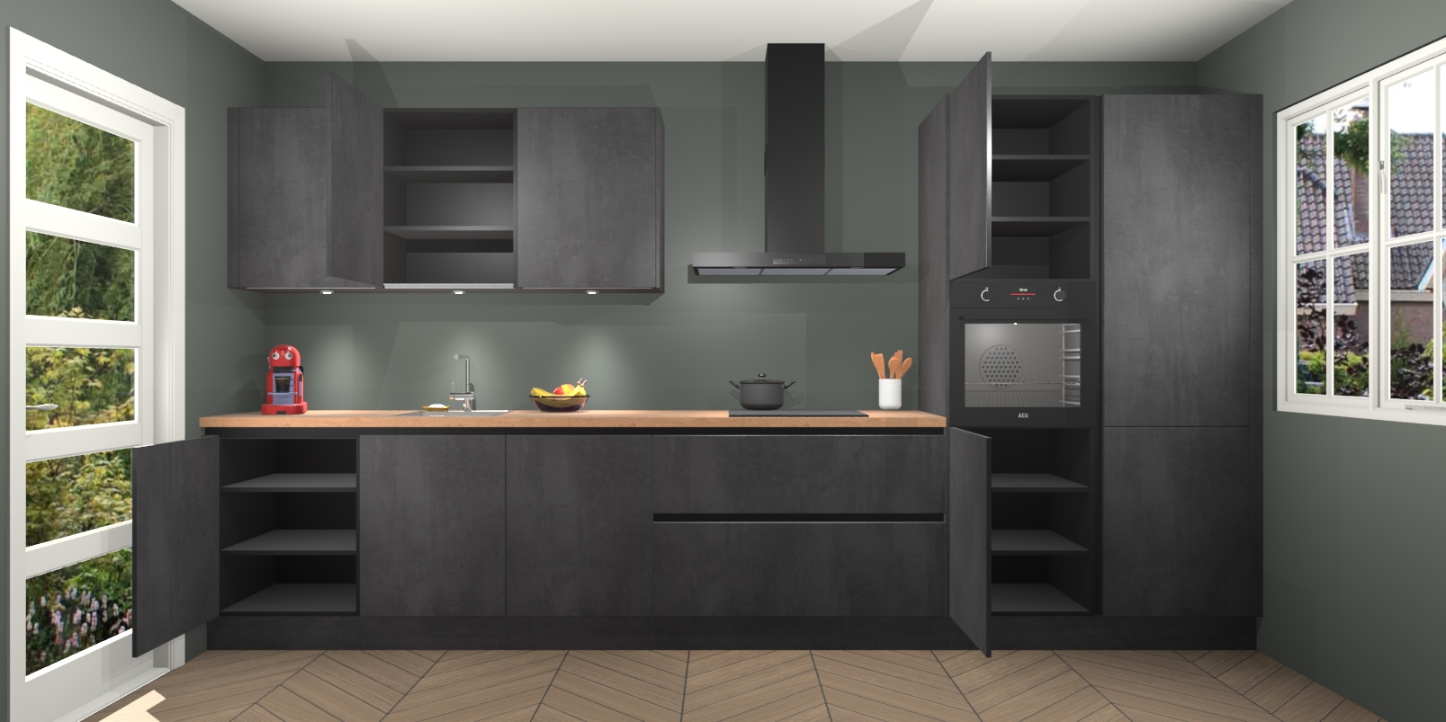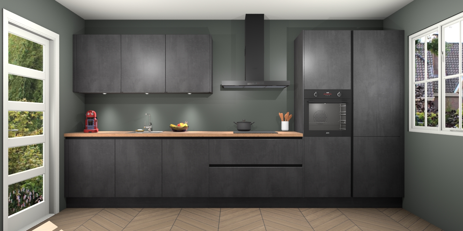 De beton parelgrijze greeploze keuken Stockholm bevat vijf spectaculaire inbouwapparaten: een oven, inductiekookplaat, afzuigkap, vaatwasser en koelkast, die na bestelling allemaal eenvoudig kunnen worden geüpgraded naar AEG. De ingenieuze soft close deuren zijn zowel praktisch als stijlvol, en voldoen met gemak aan al uw wensen.