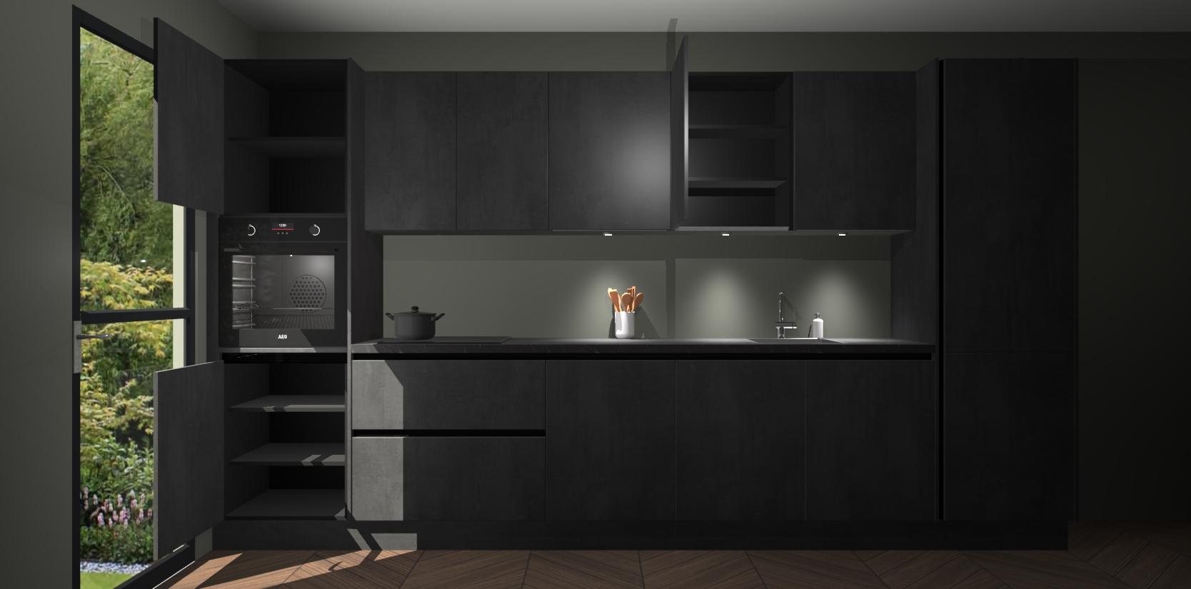 Dit is de perfecte keuken voor wie op zoek is naar een luxueuze stijl zonder zijn portemonnee te legen! Het chique ontwerp van de beton zwarte greeploze keuken Wels voegt dat vleugje verfijning toe aan elk huis. Het gemak van voorgemonteerde kasten bespaart u talloze uren tijd en energie, zodat u veel sneller dan verwacht kunt beginnen te genieten van uw prachtige nieuwe keuken. Bovendien bedraagt de levertijd slechts 7 weken.