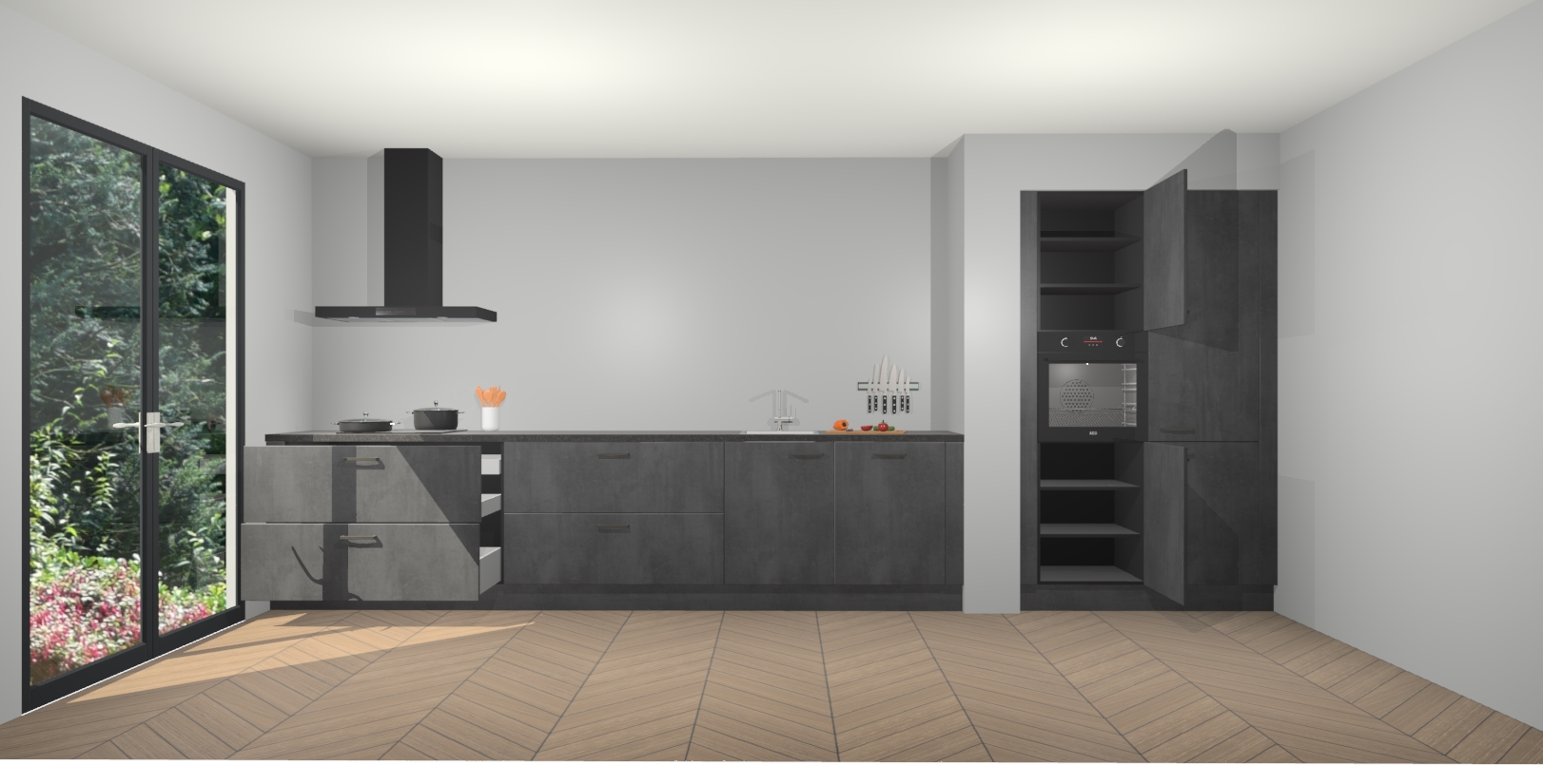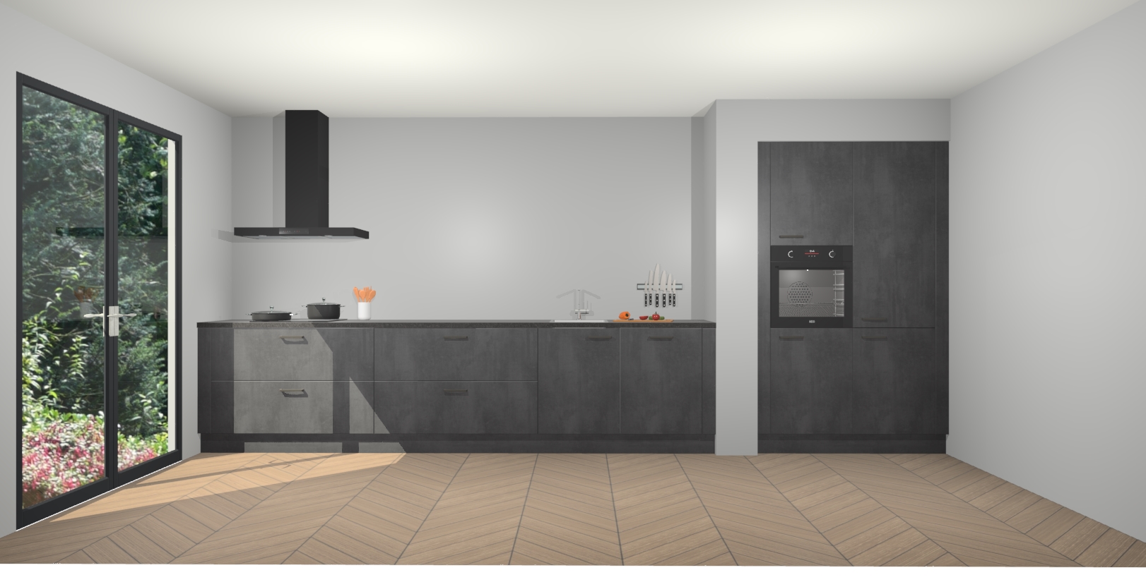 Maak kennis met de Beton Zwarte keuken Calgary - de perfecte aanvulling voor uw moderne keuken! Ervaar tijdloos design, elegantie en een chique uitstraling met onze handgrepen, soft-close deuren en veel opbergruimte. Dit alles wordt aangeboden tegen een vaste lage prijs voor ongeëvenaarde Duitse keukenkwaliteit!