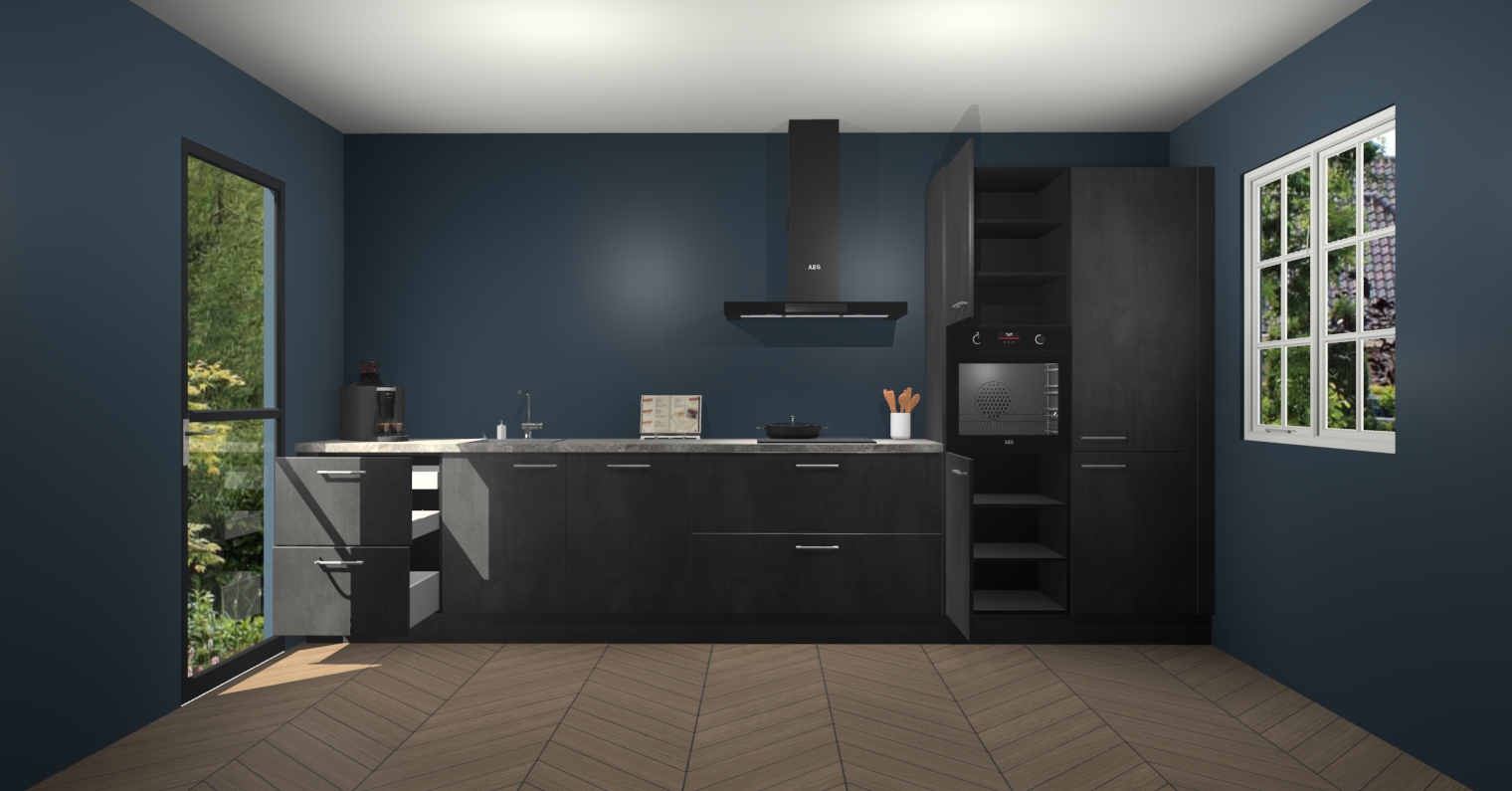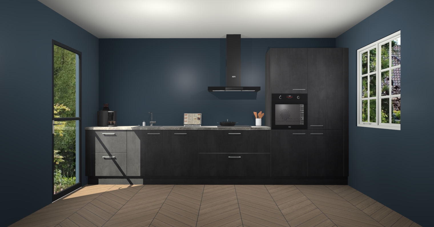 De Beton Zwarte keuken Leuven is de perfecte mix van modern en tijdloos design. Met zijn prachtige glazen deuren op de bovenkastjes voegt hij echt iets speciaals en unieks toe aan elke keuken. En met vijf ingebouwde apparaten inbegrepen - een oven, inductiekookplaat, afzuigkap, vaatwasser en koelkast - kunt u deze keuken echt helemaal van uzelf maken! U kunt na bestelling ook upgraden naar AEG voor een nog hogere kwaliteitservaring.