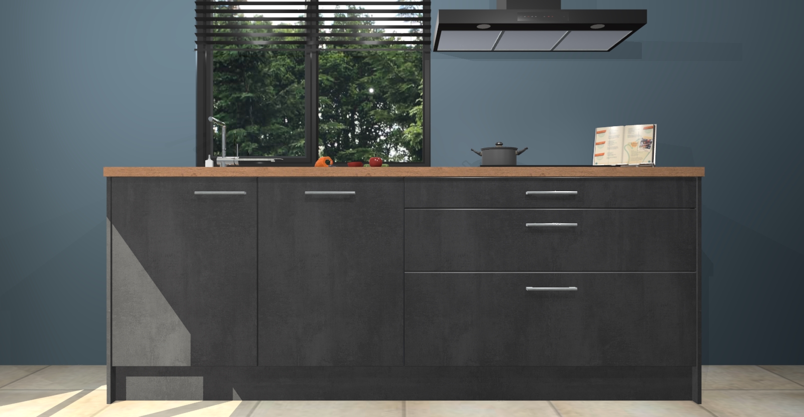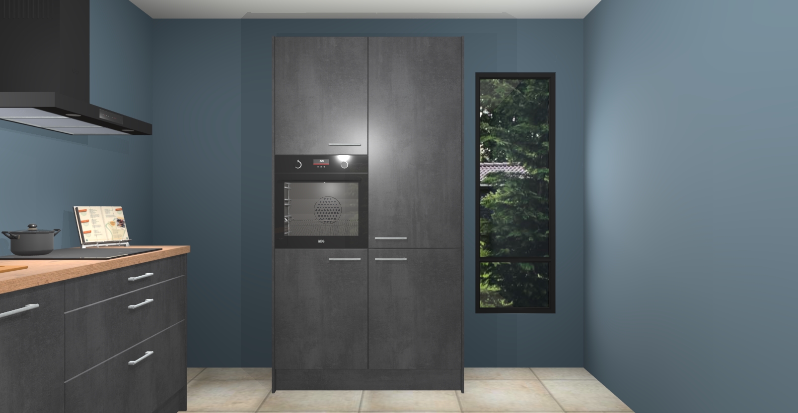 De setting is compleet gemaakt door de vijf inbouwapparaten: wanneer u gaat bestellen kunt u upgraden naar AEG-apparaten als oven, inductieplaat, afzuigkap, vaatwasser en koelkast. Kiest u voor onze Beton zwarte keuken Monaco, dan weet u zeker dat u te maken heeft met Duitse kwaliteit. Bovendien is er altijd sprake van een lage prijs en profiteren we aantrekkelijk leveringstermijn: die bedraagt slechts 7 weken ! Om het extra makkelijk te maken worden de keukenkasten reeds voorgemonteerd geleverd.