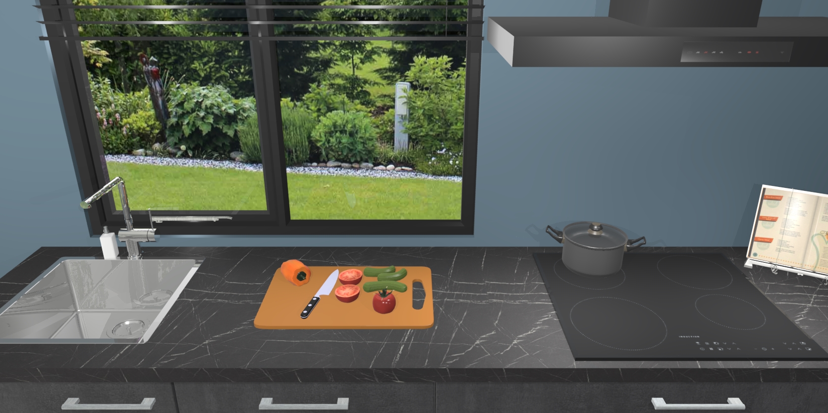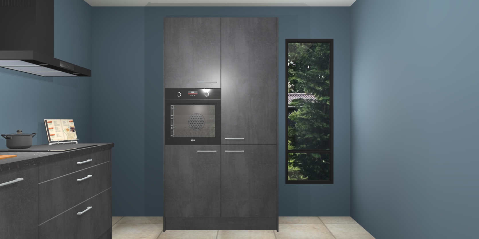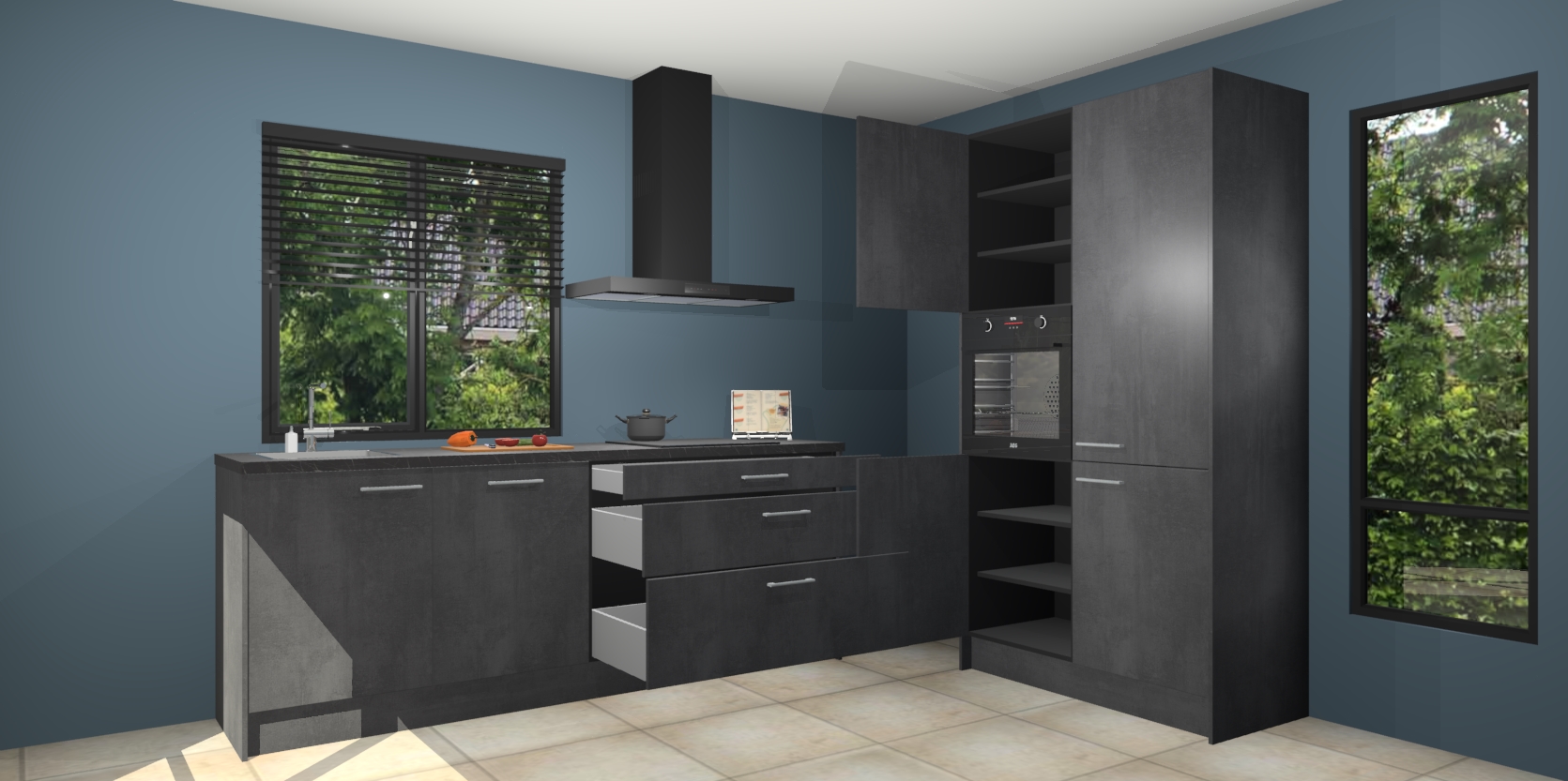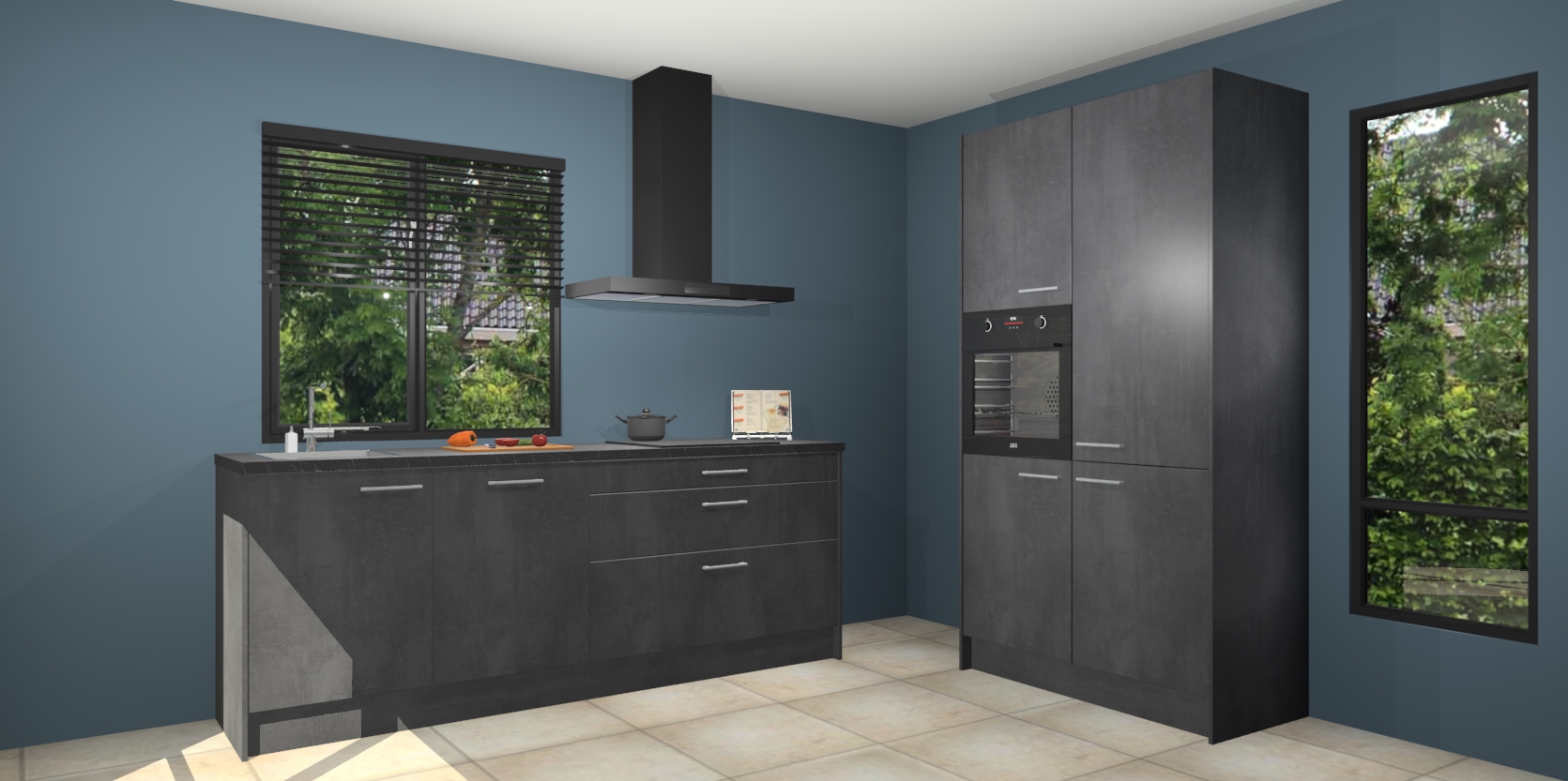 De setting is compleet gemaakt door de vijf inbouwapparaten: wanneer u gaat bestellen kunt u upgraden naar AEG-apparaten als oven, inductieplaat, afzuigkap, vaatwasser en koelkast. Kiest u voor onze Beton zwarte keuken Monaco, dan weet u zeker dat u te maken heeft met Duitse kwaliteit. Bovendien is er altijd sprake van een lage prijs en profiteren we aantrekkelijk leveringstermijn: die bedraagt slechts 7 weken ! Om het extra makkelijk te maken worden de keukenkasten reeds voorgemonteerd geleverd.