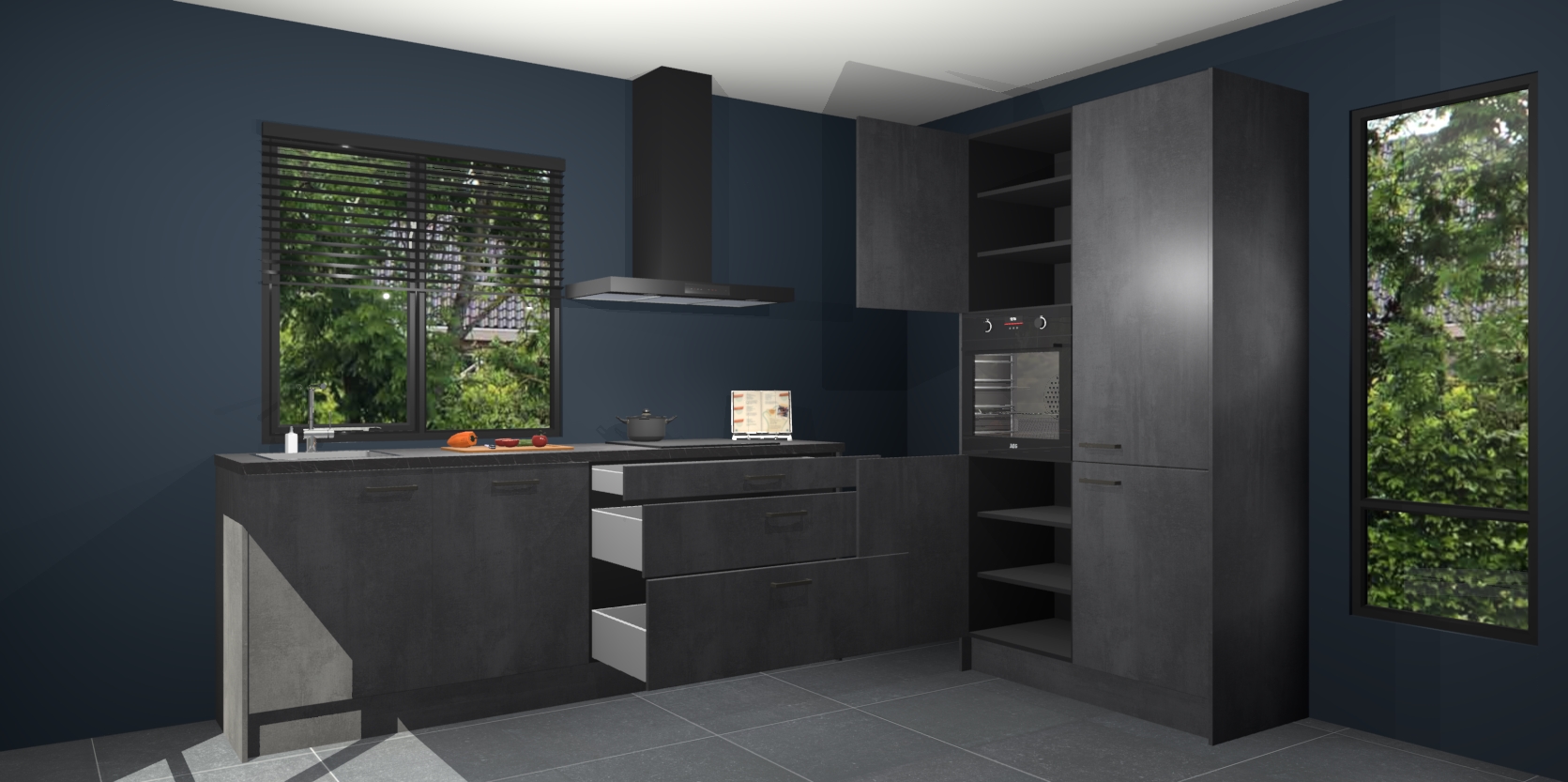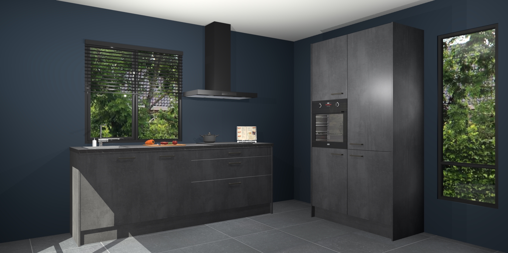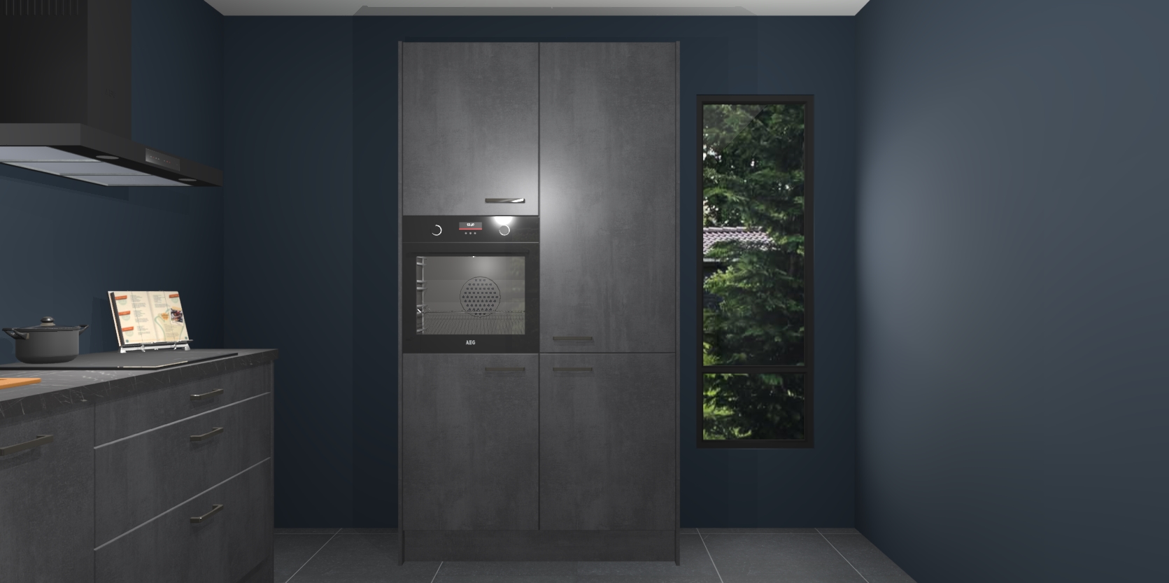 De setting is compleet gemaakt door de vijf inbouwapparaten: wanneer u gaat bestellen kunt u upgraden naar AEG-apparaten als oven, inductieplaat, afzuigkap, vaatwasser en koelkast. Kiest u voor onze Beton zwarte keuken Monaco, dan weet u zeker dat u te maken heeft met Duitse kwaliteit. Bovendien is er altijd sprake van een lage prijs en profiteren we aantrekkelijk leveringstermijn: die bedraagt slechts 7 weken ! Om het extra makkelijk te maken worden de keukenkasten reeds voorgemonteerd geleverd.