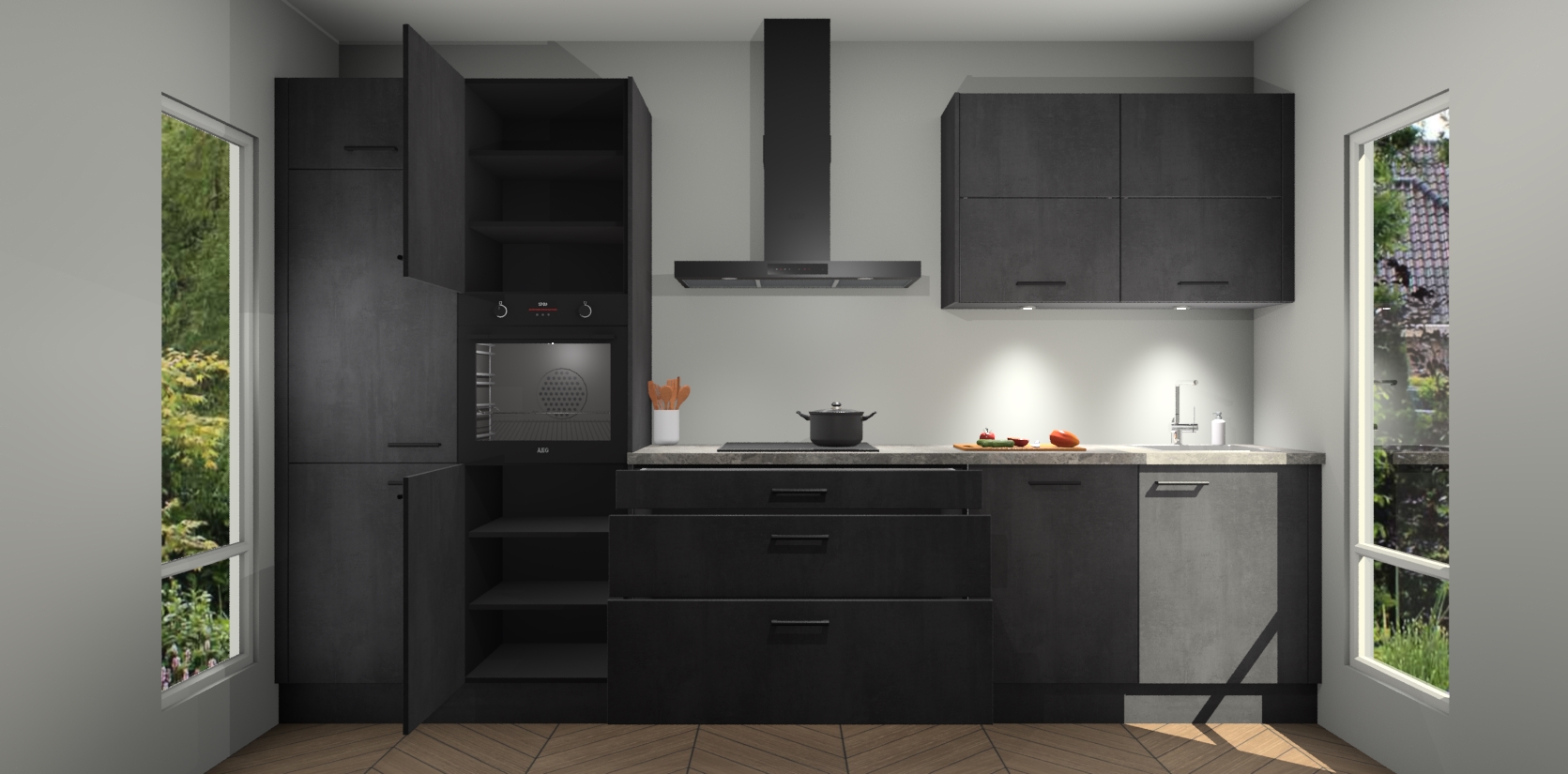 De glanzende afwerking van de deuren is gemaakt met behulp van geavanceerde coatingtechnologie, waardoor schoonmaken na het eten eenvoudig en efficiënt is. Bovendien zijn er geen handgrepen nodig, waardoor deze keuken zowel modern als verfijnd is. Of u nu op zoek bent naar een minimalistische toevoeging aan een hedendaags huis of naar iets stijlvollers en tijdlozers in een traditionele huiselijke omgeving, onze Beton Zwarte Keuken Parijs is een geweldige oplossing.