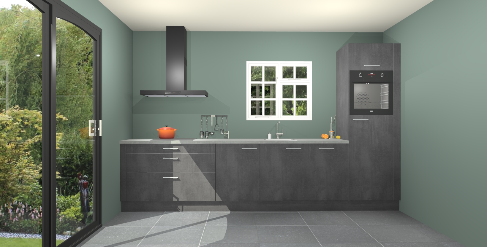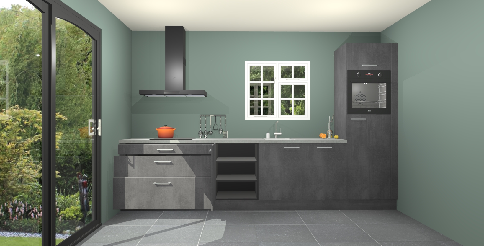 Maak kennis met de beton zwarte keuken Sofia: de perfecte mix van stijl en gemak. De keuken heeft vijf inbouw apparaten, plus een werkblad in houtlook dat meteen warmte en verfijning toevoegt.