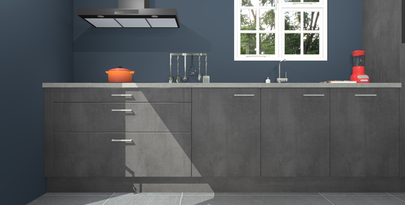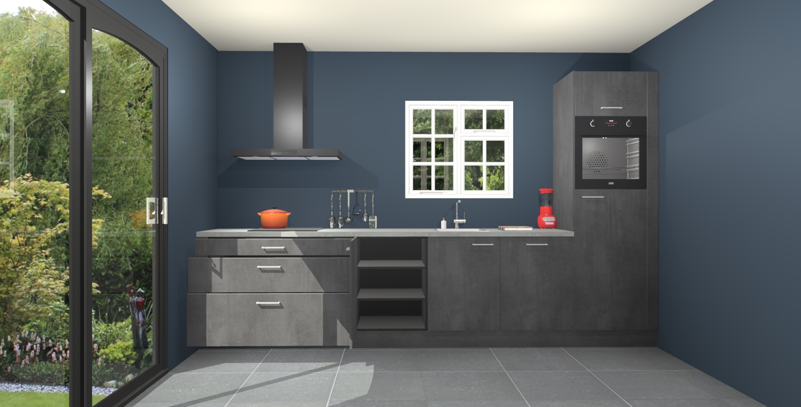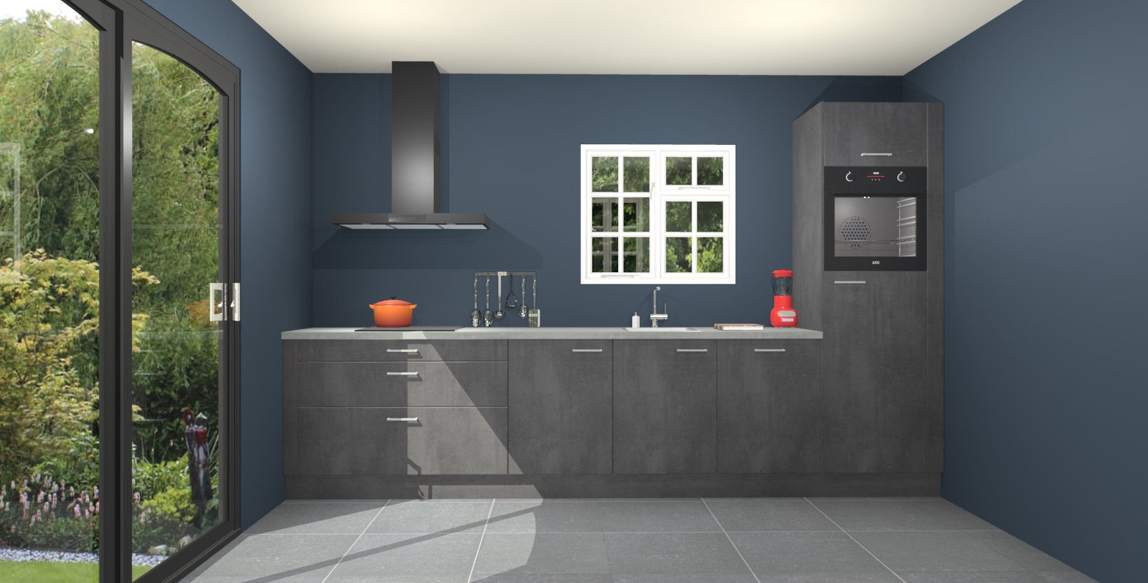 Maak kennis met de beton zwarte keuken Sofia: de perfecte mix van stijl en gemak. De keuken heeft vijf inbouw apparaten, plus een werkblad in houtlook dat meteen warmte en verfijning toevoegt.