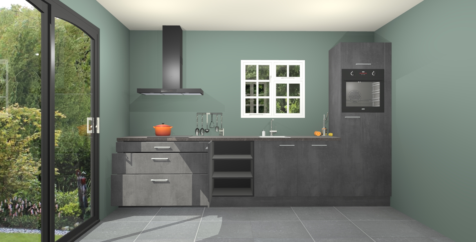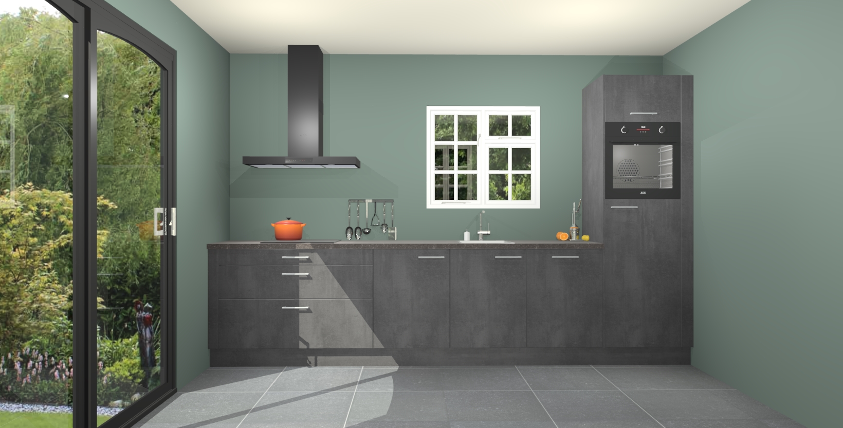 Maak kennis met de beton zwarte keuken Sofia: de perfecte mix van stijl en gemak. De keuken heeft vijf inbouw apparaten, plus een werkblad in houtlook dat meteen warmte en verfijning toevoegt.