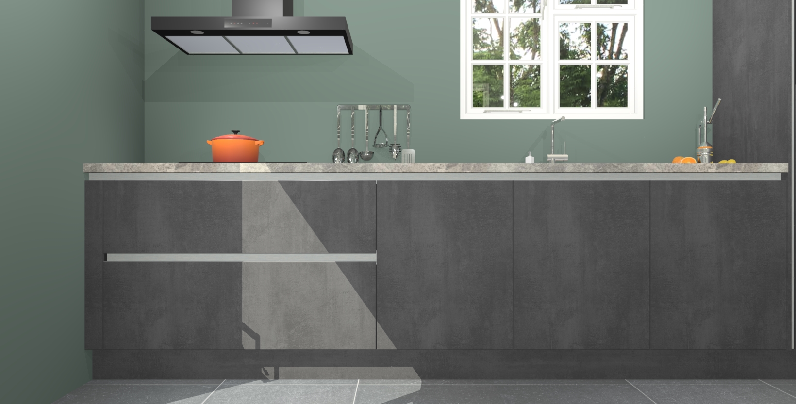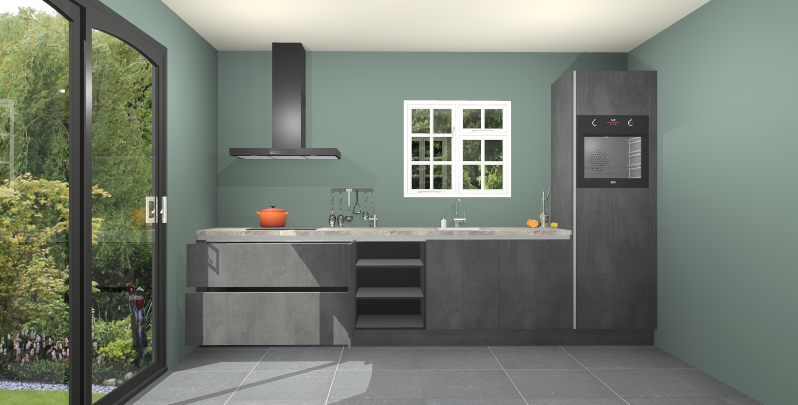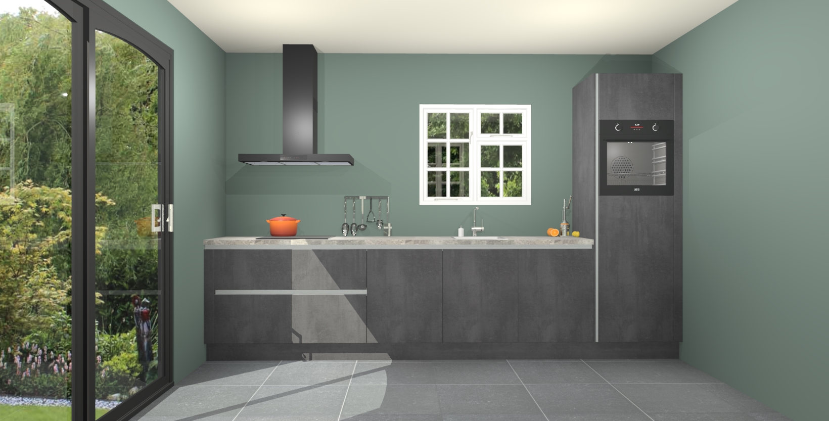 Maak kennis met de beton zwarte keuken Sofia: de perfecte mix van stijl en gemak. De keuken heeft vijf inbouw apparaten, plus een werkblad in houtlook dat meteen warmte en verfijning toevoegt.