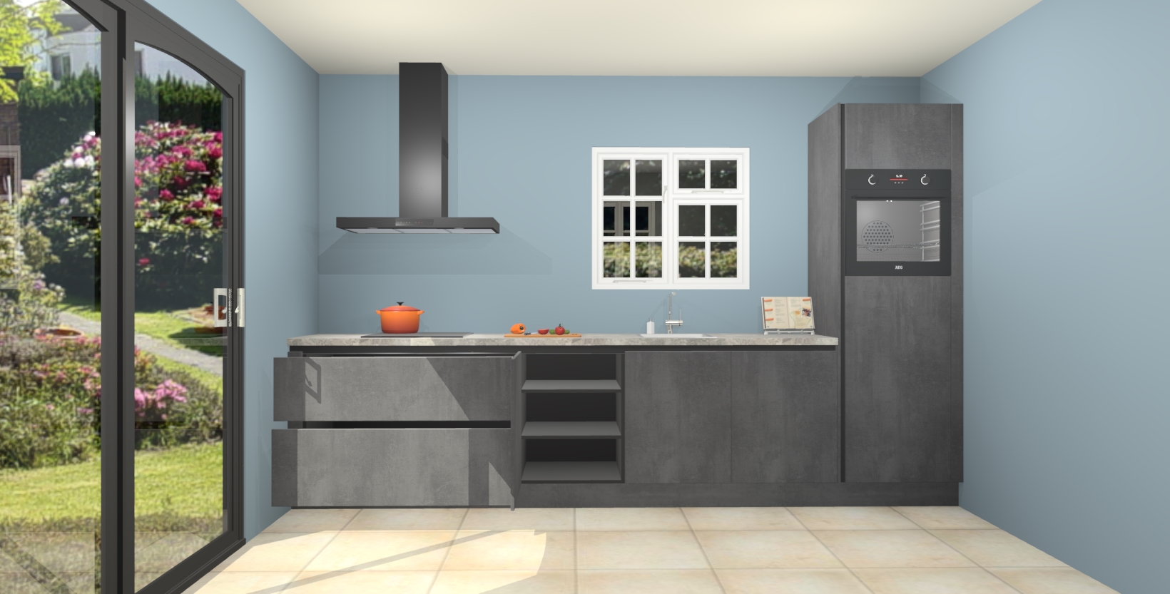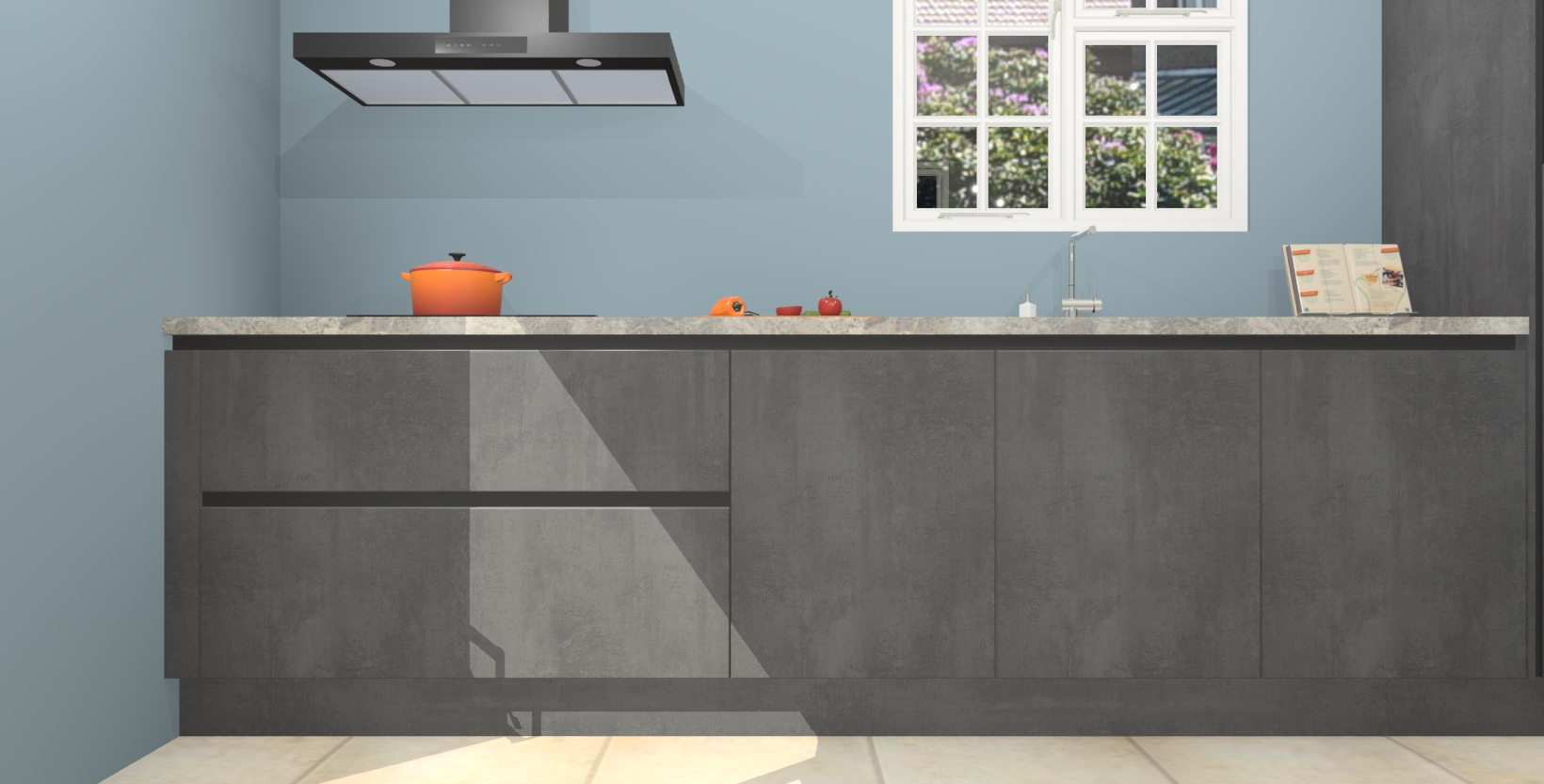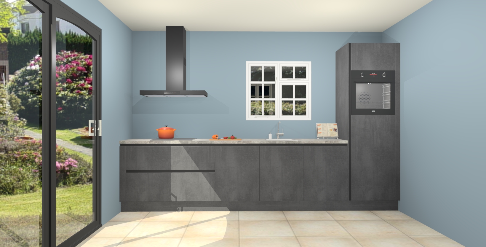 Maak kennis met de beton zwarte keuken Sofia: de perfecte mix van stijl en gemak. De keuken heeft vijf inbouw apparaten, plus een werkblad in houtlook dat meteen warmte en verfijning toevoegt.