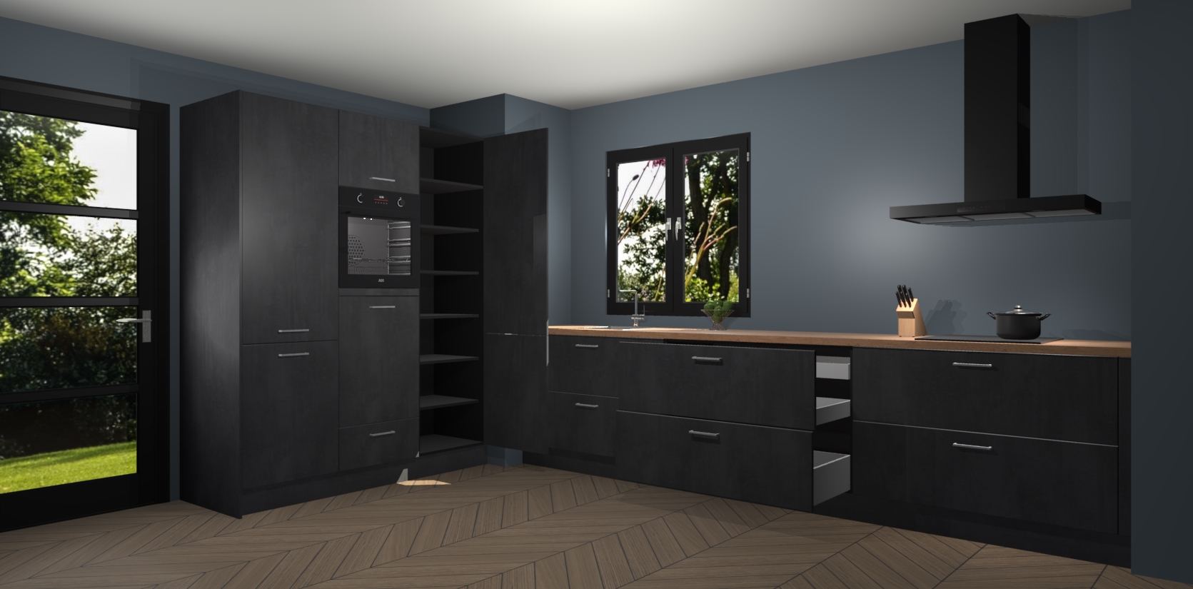 De softclose deuren openen en sluiten is ook heel eenvoudig - geniet van een moeiteloze keukenervaring, zelfs als er kinderen rondlopen. Voor extra gemak bij het plaatsen van uw bestelling bieden we ook een upgrade naar een kookplaat met geïntegreerde afzuiging.