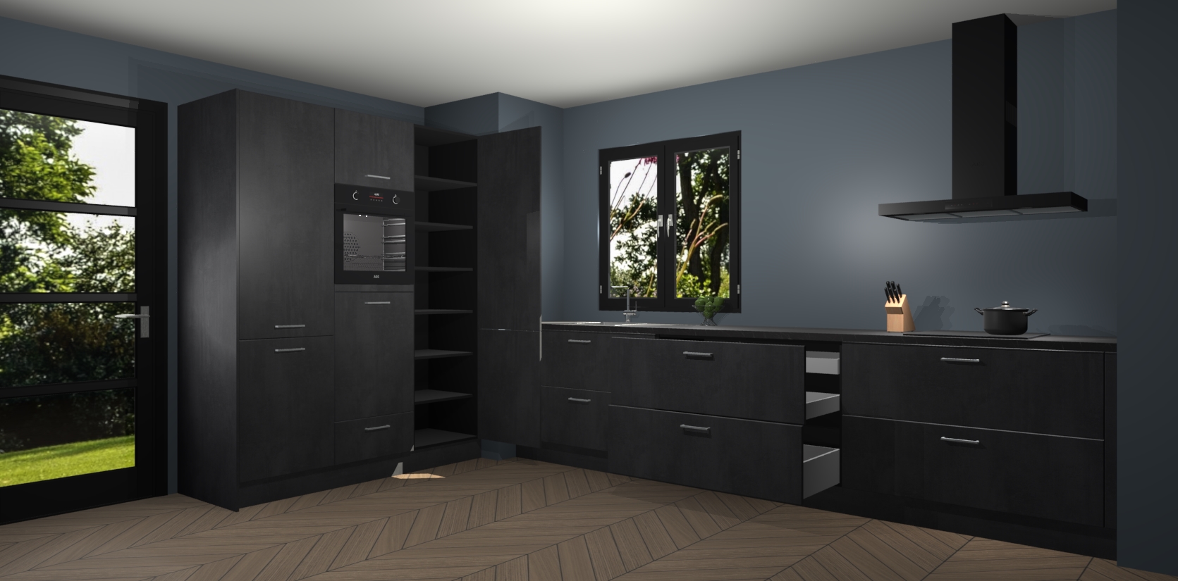 De softclose deuren openen en sluiten is ook heel eenvoudig - geniet van een moeiteloze keukenervaring, zelfs als er kinderen rondlopen. Voor extra gemak bij het plaatsen van uw bestelling bieden we ook een upgrade naar een kookplaat met geïntegreerde afzuiging.