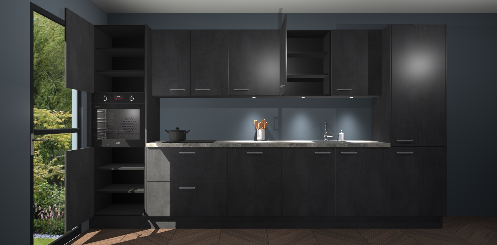 Dit is de perfecte keuken voor wie op zoek is naar een luxueuze stijl zonder zijn portemonnee te legen! Het chique ontwerp van de beton zwarte keuken Wels voegt dat vleugje verfijning toe aan elk huis. Het gemak van voorgemonteerde kasten bespaart u talloze uren tijd en energie, zodat u veel sneller dan verwacht kunt beginnen te genieten van uw prachtige nieuwe keuken. Bovendien bedraagt de levertijd slechts 7 weken.