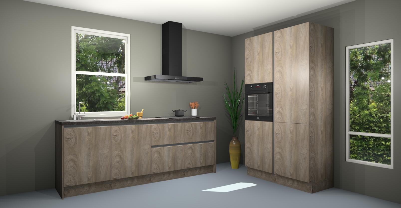 De Cantaro eiken greeploze keuken Monaco heeft voldoende opbergruimte om uw keukenbenodigdheden georganiseerd en netjes te houden. Geniet van het gemak van de soft-close deuren, die deze stijlvolle look perfect afmaken. Maar dat is nog niet alles. Met de Cantaro eiken greeploze keuken Monaco krijgt u maar liefst 5 ingebouwde apparaten: een oven, inductiekookplaat, afzuigkap, vaatwasser en koelkast. Deze kunnen gemakkelijk worden geüpgraded naar AEG als ze besteld zijn.