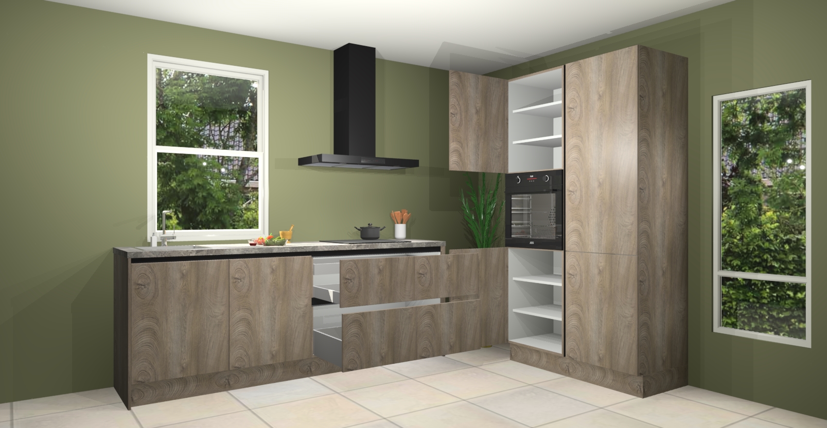 De Cantaro eiken greeploze keuken Monaco heeft voldoende opbergruimte om uw keukenbenodigdheden georganiseerd en netjes te houden. Geniet van het gemak van de soft-close deuren, die deze stijlvolle look perfect afmaken. Maar dat is nog niet alles. Met de Cantaro eiken greeploze keuken Monaco krijgt u maar liefst 5 ingebouwde apparaten: een oven, inductiekookplaat, afzuigkap, vaatwasser en koelkast. Deze kunnen gemakkelijk worden geüpgraded naar AEG als ze besteld zijn.