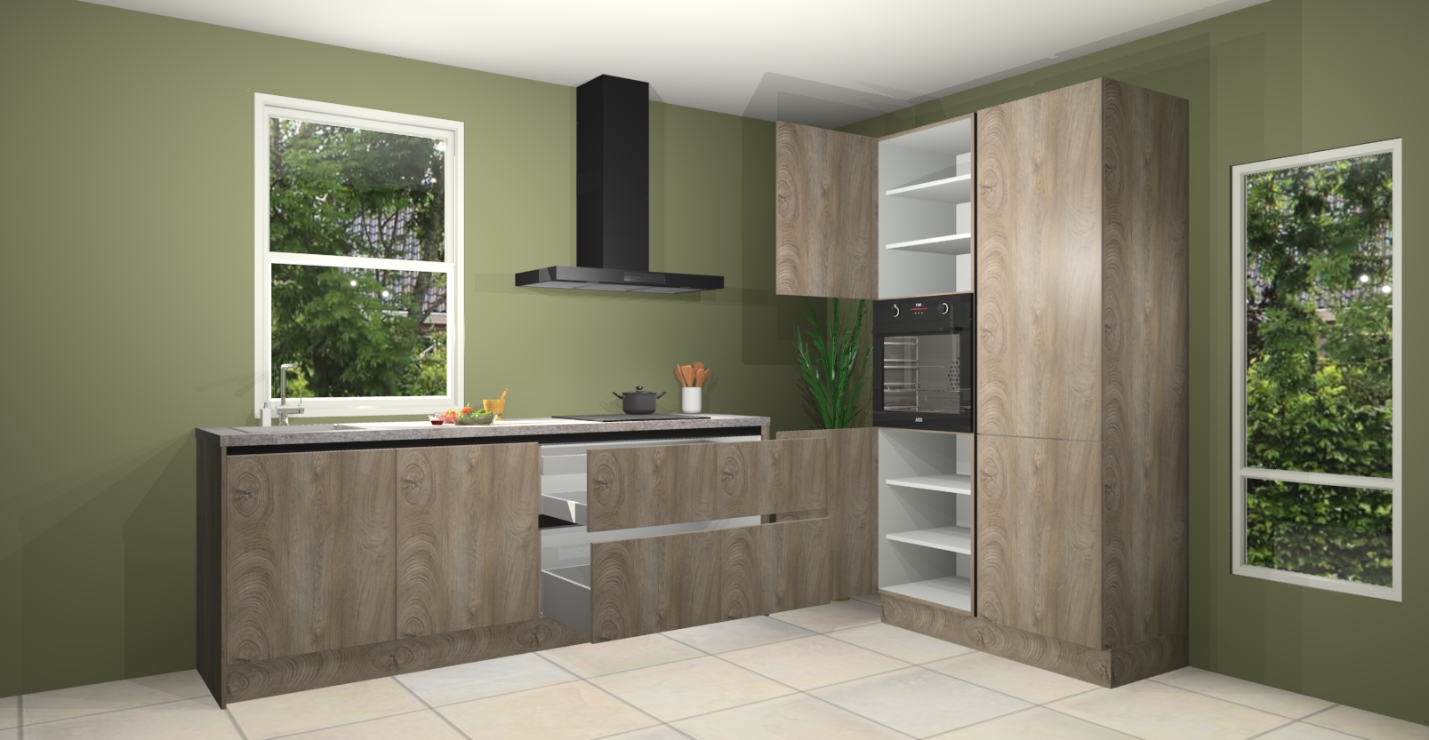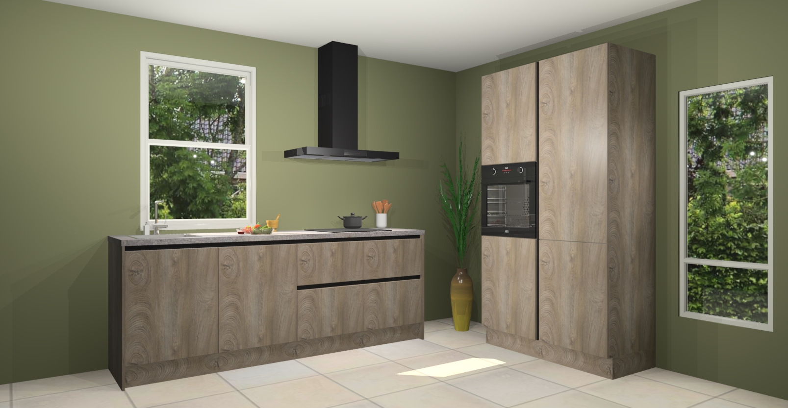 De Cantaro eiken greeploze keuken Monaco heeft voldoende opbergruimte om uw keukenbenodigdheden georganiseerd en netjes te houden. Geniet van het gemak van de soft-close deuren, die deze stijlvolle look perfect afmaken. Maar dat is nog niet alles. Met de Cantaro eiken greeploze keuken Monaco krijgt u maar liefst 5 ingebouwde apparaten: een oven, inductiekookplaat, afzuigkap, vaatwasser en koelkast. Deze kunnen gemakkelijk worden geüpgraded naar AEG als ze besteld zijn.