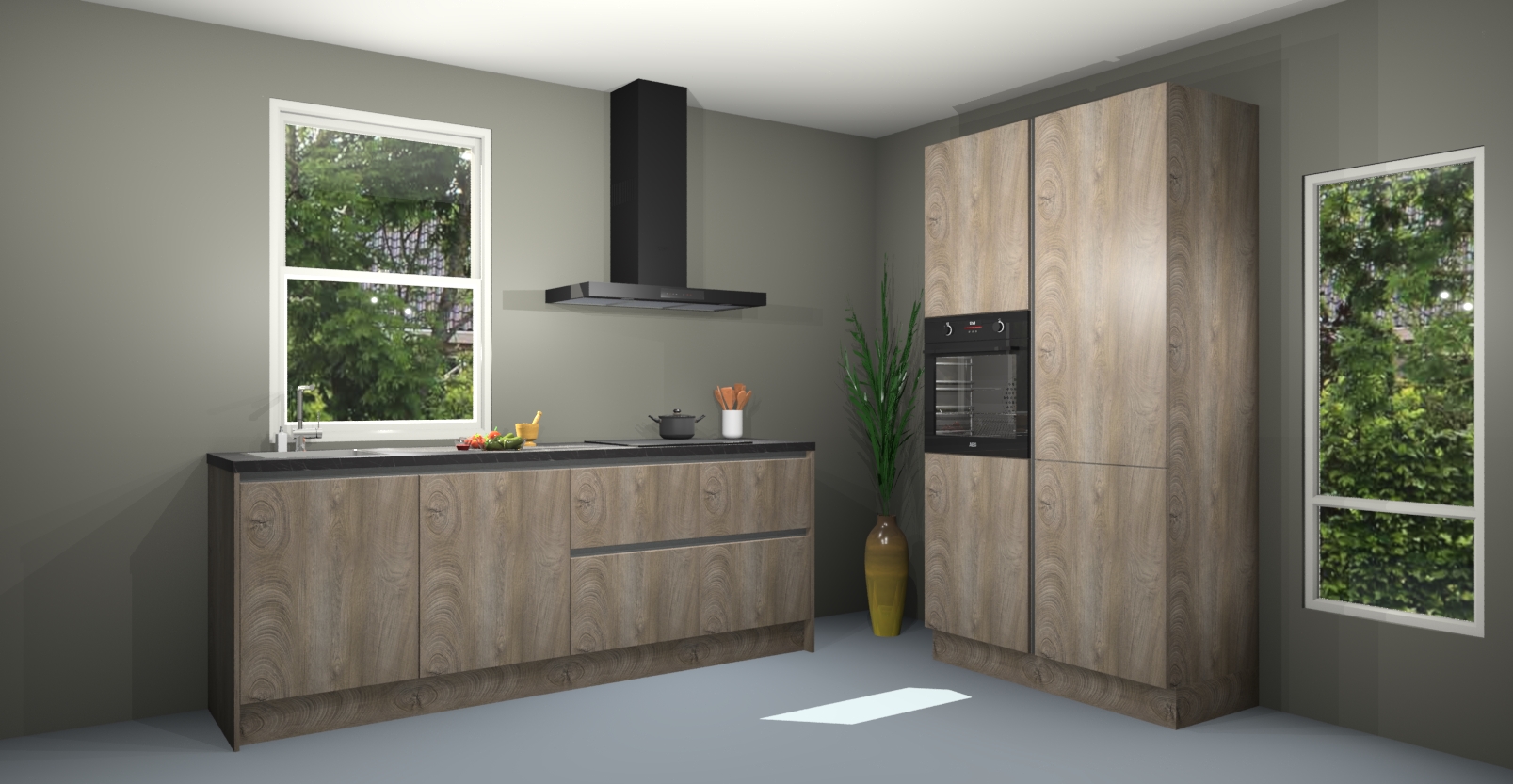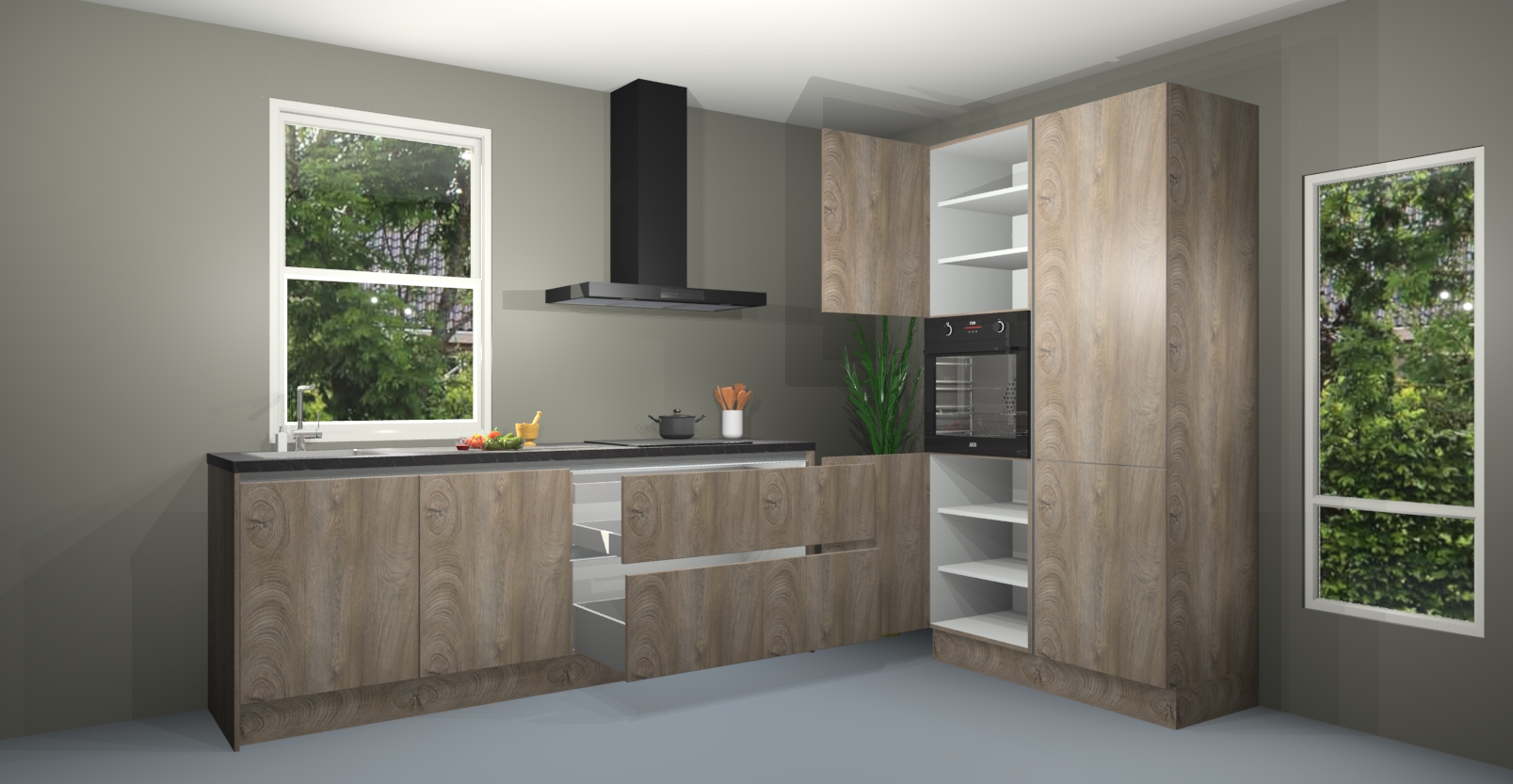 De Cantaro eiken greeploze keuken Monaco heeft voldoende opbergruimte om uw keukenbenodigdheden georganiseerd en netjes te houden. Geniet van het gemak van de soft-close deuren, die deze stijlvolle look perfect afmaken. Maar dat is nog niet alles. Met de Cantaro eiken greeploze keuken Monaco krijgt u maar liefst 5 ingebouwde apparaten: een oven, inductiekookplaat, afzuigkap, vaatwasser en koelkast. Deze kunnen gemakkelijk worden geüpgraded naar AEG als ze besteld zijn.