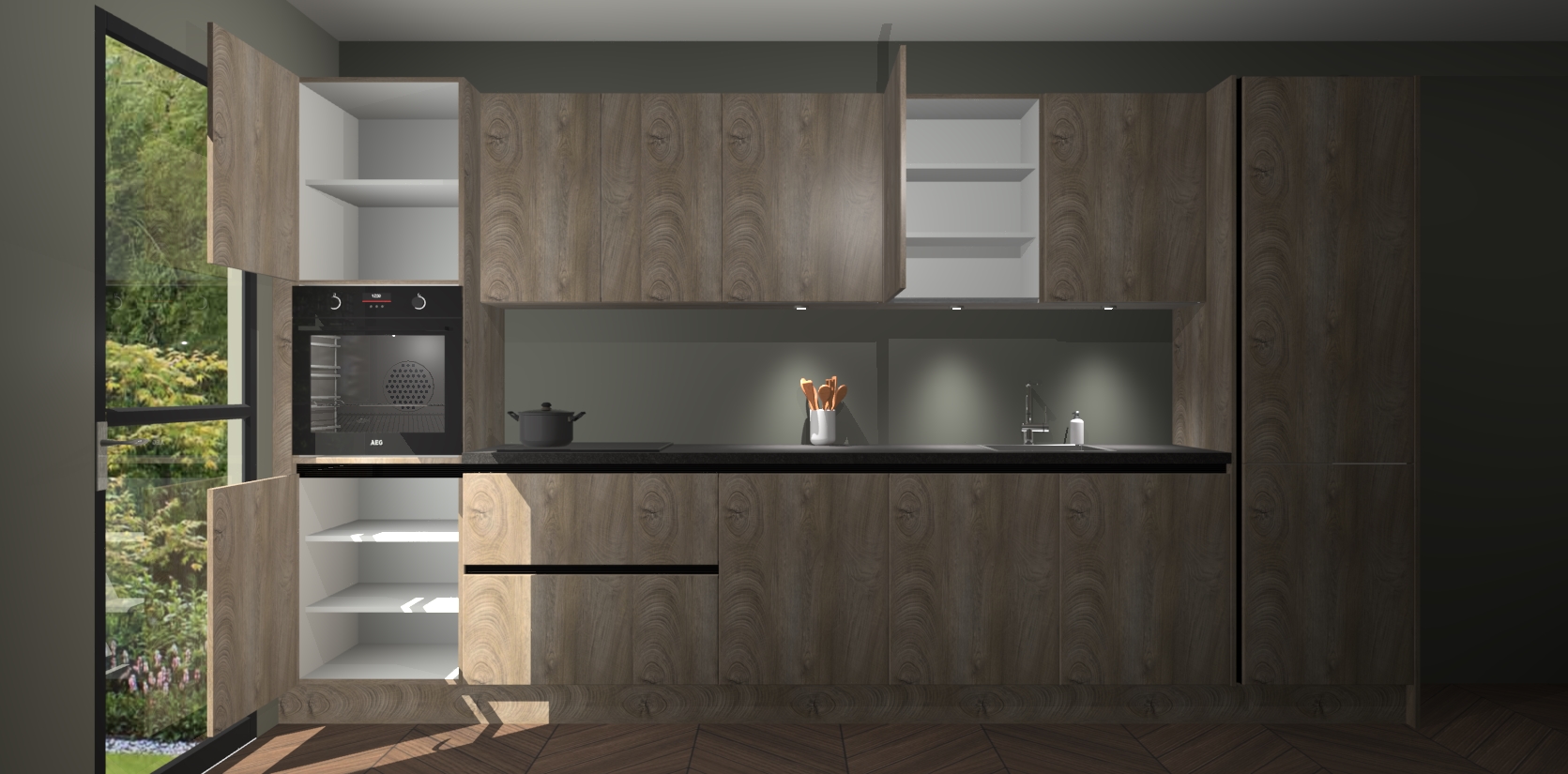 Dit is de perfecte keuken voor wie op zoek is naar een luxueuze stijl zonder zijn portemonnee te legen! Het chique ontwerp van de cantaro eiken greeploze keuken Wels voegt dat vleugje verfijning toe aan elk huis. Het gemak van voorgemonteerde kasten bespaart u talloze uren tijd en energie, zodat u veel sneller dan verwacht kunt beginnen te genieten van uw prachtige nieuwe keuken. Bovendien bedraagt de levertijd slechts 7 weken.