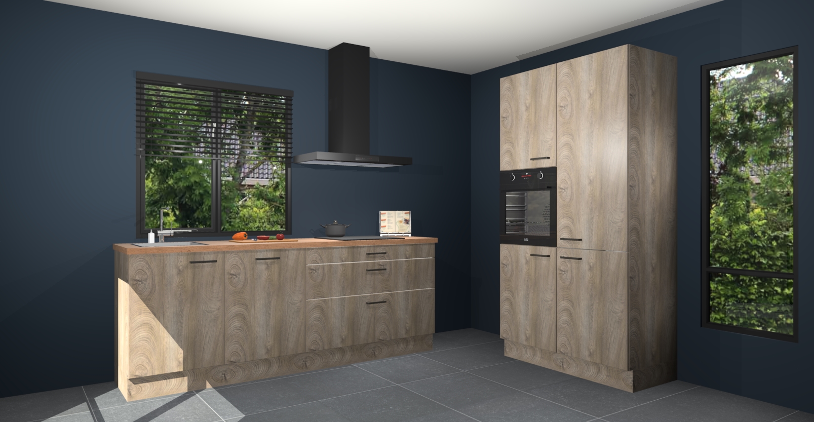 De setting is compleet gemaakt door de vijf inbouwapparaten: wanneer u gaat bestellen kunt u upgraden naar AEG-apparaten als oven, inductieplaat, afzuigkap, vaatwasser en koelkast. Kiest u voor onze Cantaro eiken keuken Monaco, dan weet u zeker dat u te maken heeft met Duitse kwaliteit. Bovendien is er altijd sprake van een lage prijs en profiteren we aantrekkelijk leveringstermijn: die bedraagt slechts 7 weken ! Om het extra makkelijk te maken worden de keukenkasten reeds voorgemonteerd geleverd.