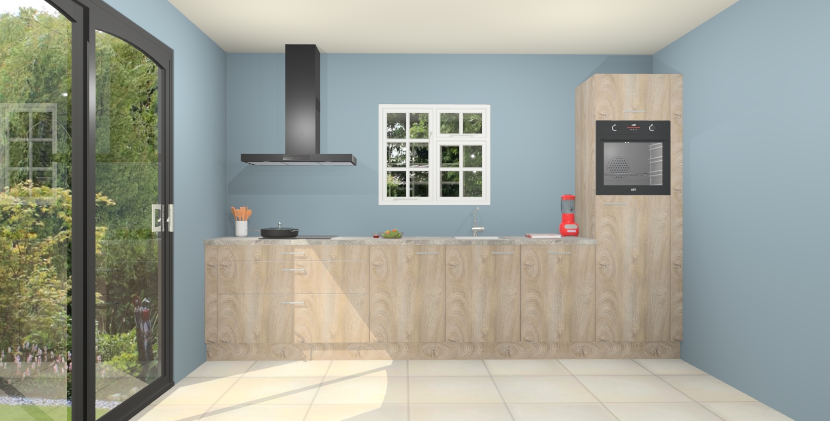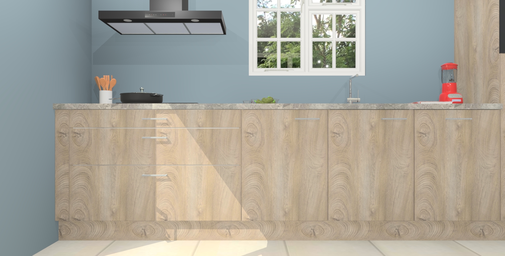 Maak kennis met de cantaro eiken keuken Sofia: de perfecte mix van stijl en gemak. De keuken heeft vijf inbouw apparaten, plus een werkblad in houtlook dat meteen warmte en verfijning toevoegt.