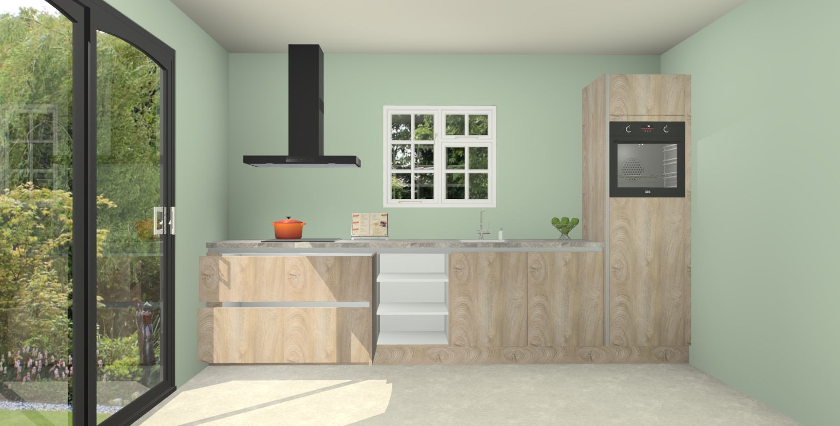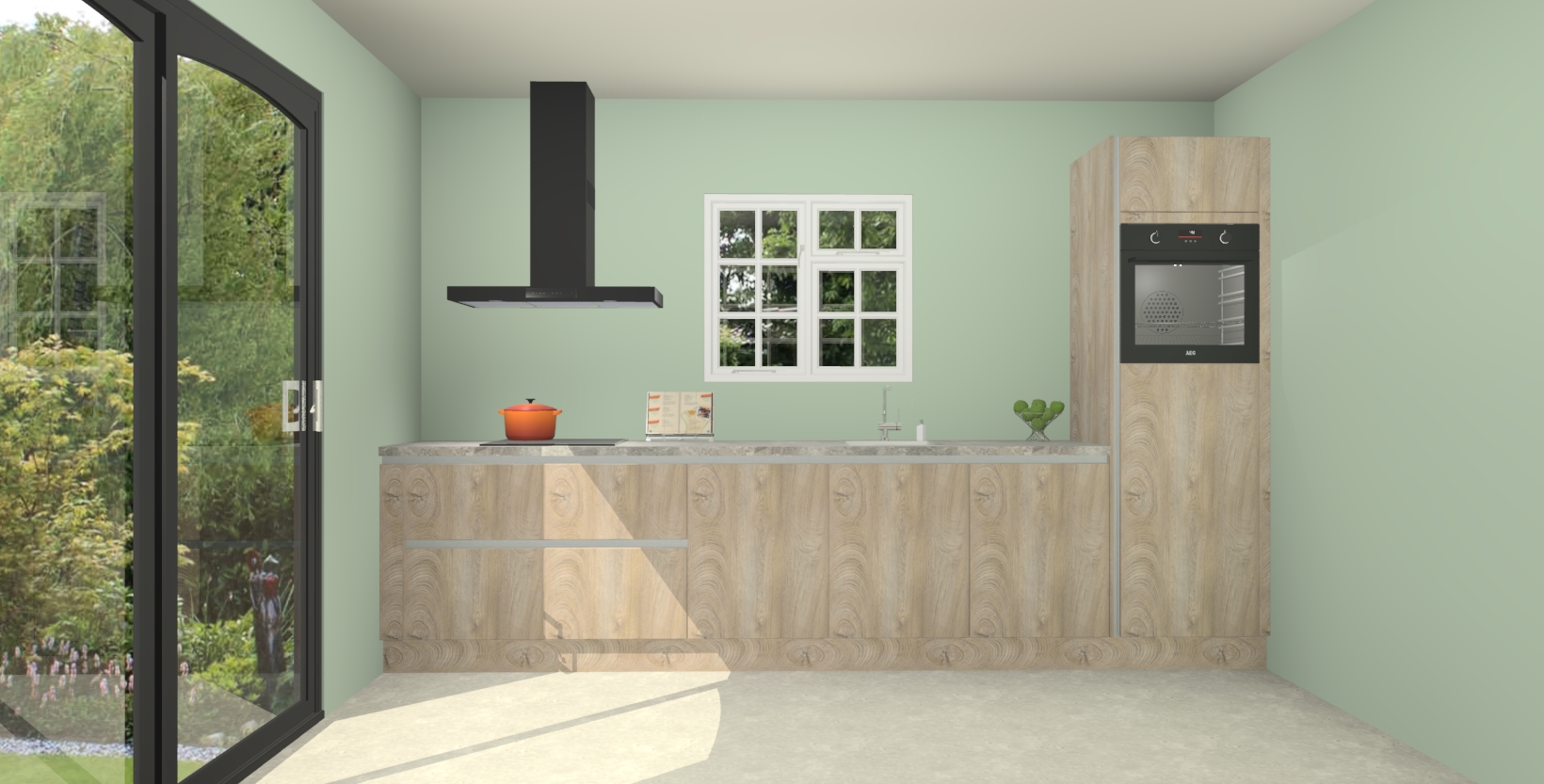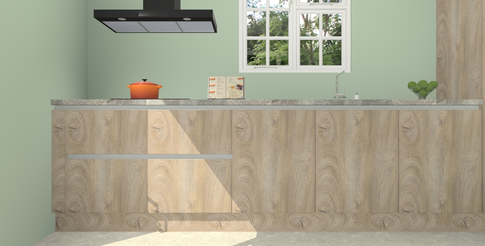 Maak kennis met de cantaro eiken keuken Sofia: de perfecte mix van stijl en gemak. De keuken heeft vijf inbouw apparaten, plus een werkblad in houtlook dat meteen warmte en verfijning toevoegt.