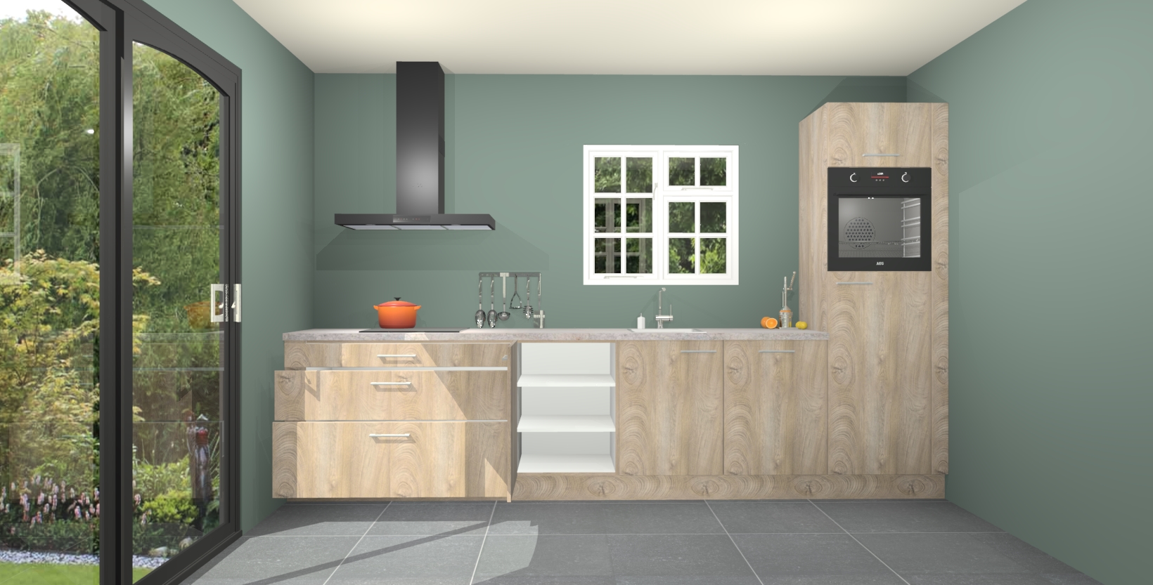 Maak kennis met de cantaro eiken keuken Sofia: de perfecte mix van stijl en gemak. De keuken heeft vijf inbouw apparaten, plus een werkblad in houtlook dat meteen warmte en verfijning toevoegt.