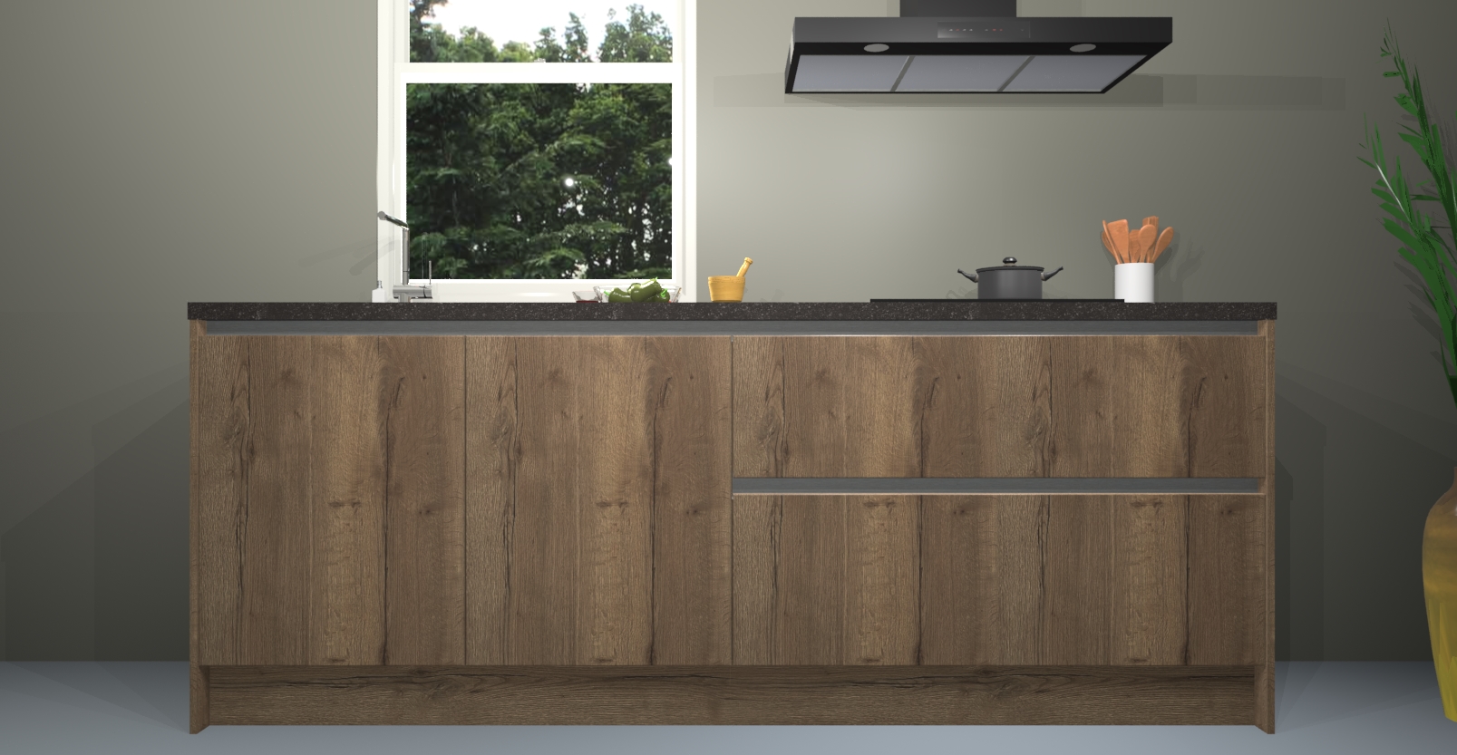 De Chocolade eiken greeploze keuken Monaco heeft voldoende opbergruimte om uw keukenbenodigdheden georganiseerd en netjes te houden. Geniet van het gemak van de soft-close deuren, die deze stijlvolle look perfect afmaken. Maar dat is nog niet alles. Met de Chocolade eiken greeploze keuken Monaco krijgt u maar liefst 5 ingebouwde apparaten: een oven, inductiekookplaat, afzuigkap, vaatwasser en koelkast. Deze kunnen gemakkelijk worden geüpgraded naar AEG als ze besteld zijn.