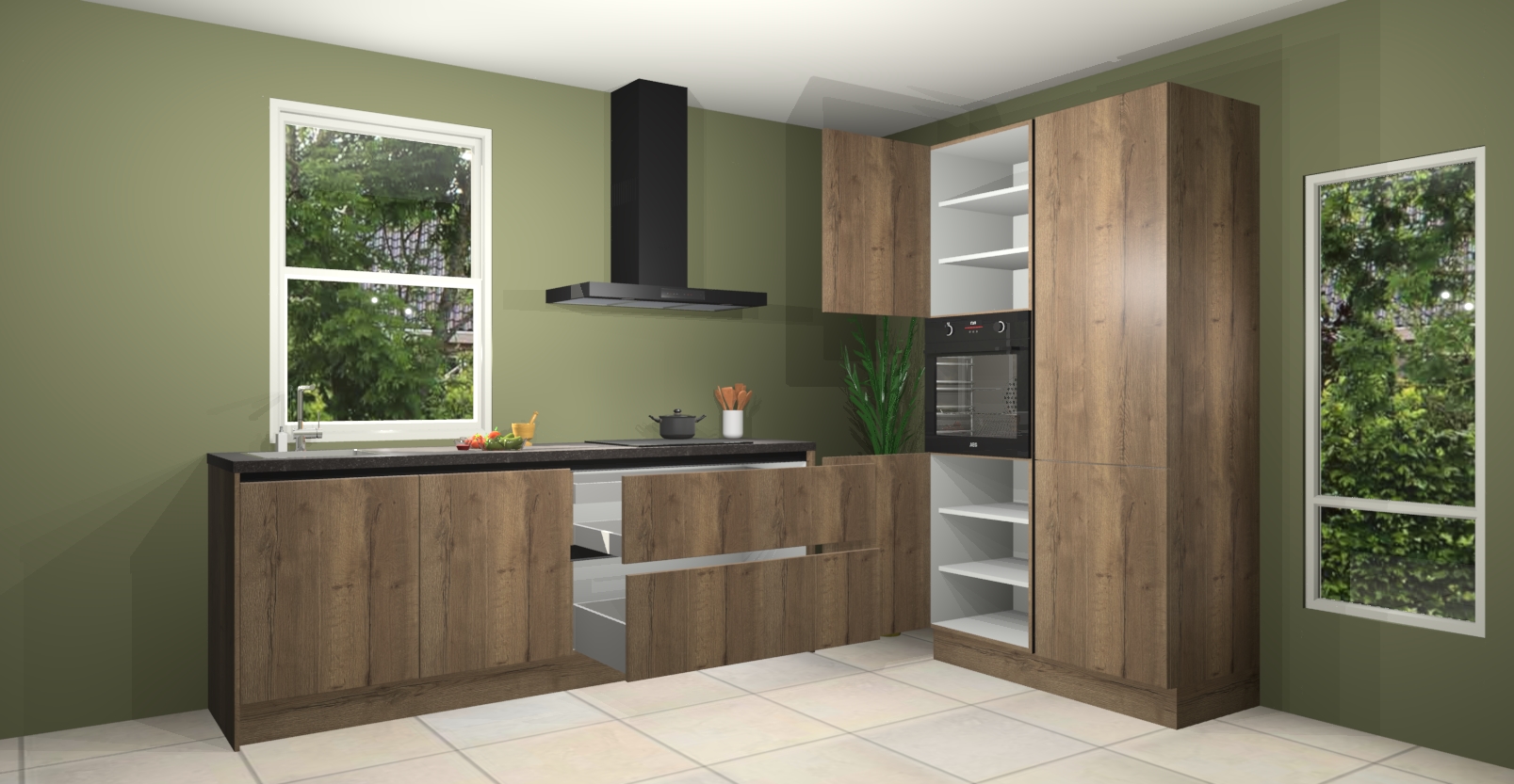 Ervaar het ultieme gevoel van warmte en gezelligheid in uw huis met de luxe Chocolade eiken greeploze keuken Monaco! Deze ongelooflijk sfeervolle houtlook straalt heerlijke warmte uit en tovert elke keuken om tot een gezellig familiecentrum. Breng uw dromen tot leven met deze unieke keuken, ontworpen voor moeiteloze luxe en functionaliteit.
