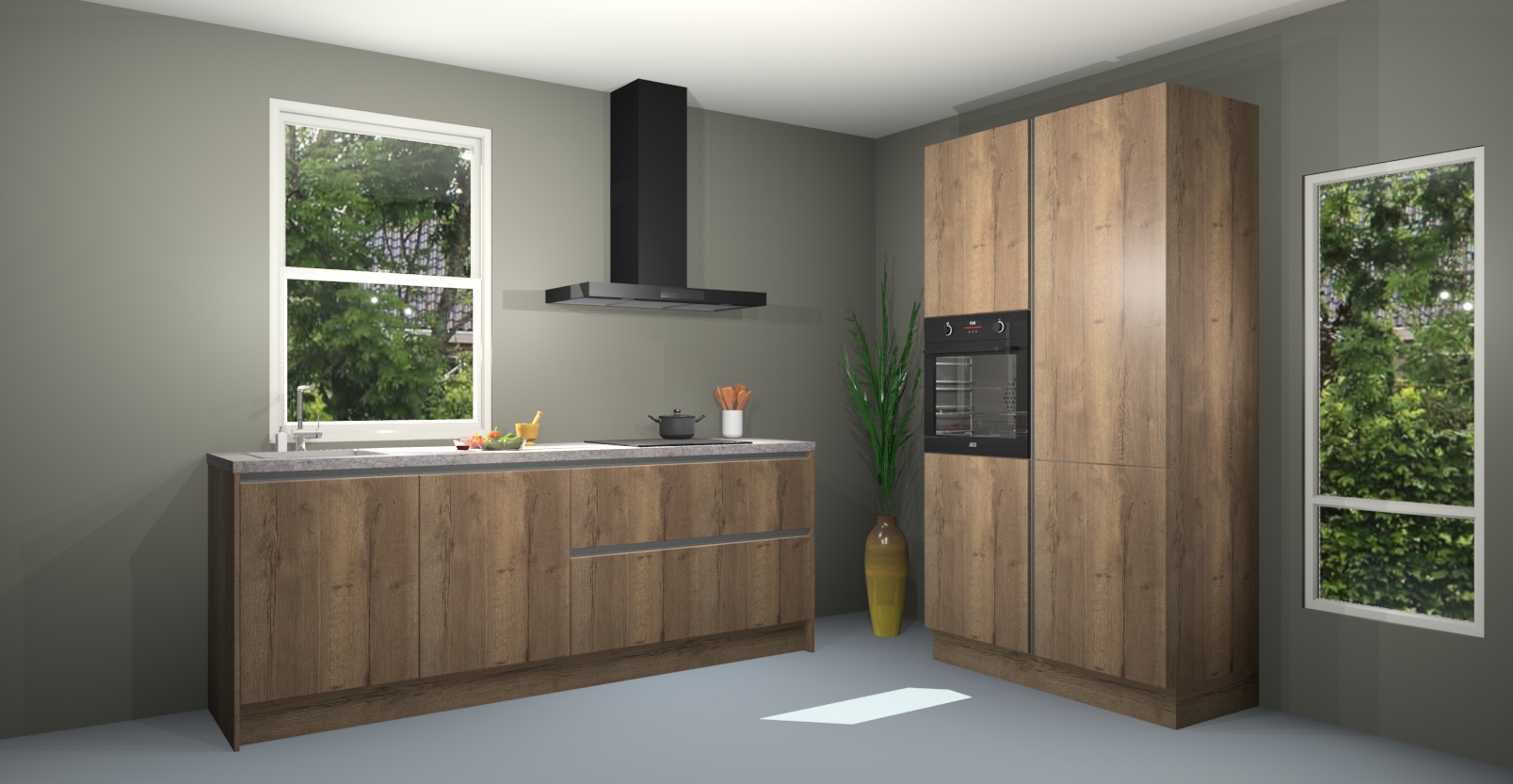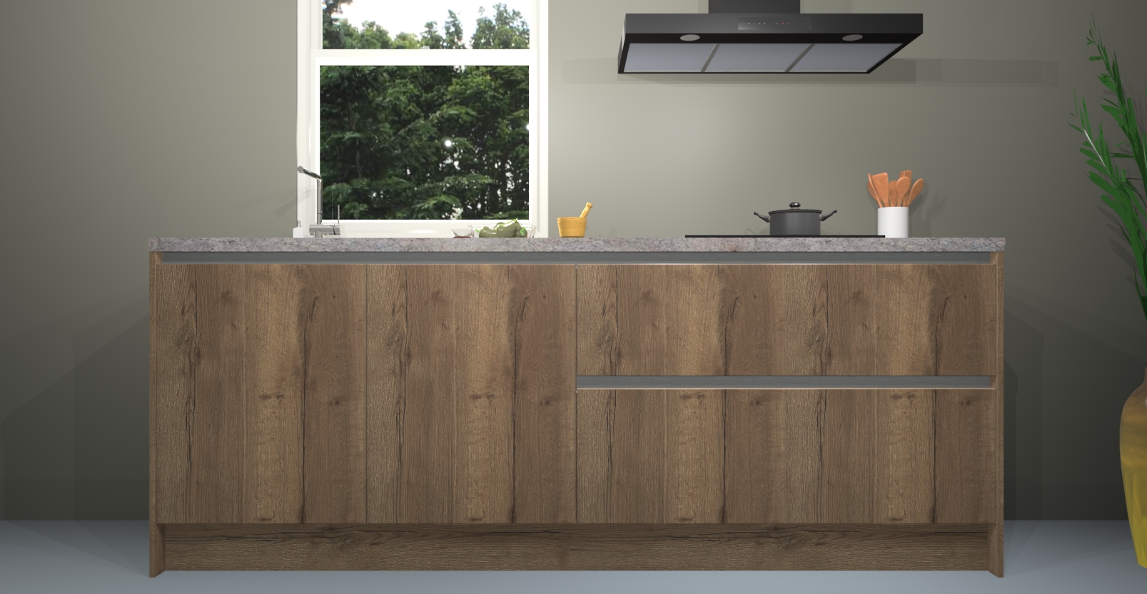 De Chocolade eiken greeploze keuken Monaco heeft voldoende opbergruimte om uw keukenbenodigdheden georganiseerd en netjes te houden. Geniet van het gemak van de soft-close deuren, die deze stijlvolle look perfect afmaken. Maar dat is nog niet alles. Met de Chocolade eiken greeploze keuken Monaco krijgt u maar liefst 5 ingebouwde apparaten: een oven, inductiekookplaat, afzuigkap, vaatwasser en koelkast. Deze kunnen gemakkelijk worden geüpgraded naar AEG als ze besteld zijn.