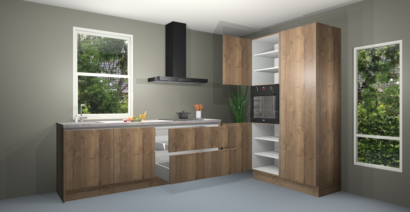 Ervaar het ultieme gevoel van warmte en gezelligheid in uw huis met de luxe Chocolade eiken greeploze keuken Monaco! Deze ongelooflijk sfeervolle houtlook straalt heerlijke warmte uit en tovert elke keuken om tot een gezellig familiecentrum. Breng uw dromen tot leven met deze unieke keuken, ontworpen voor moeiteloze luxe en functionaliteit.