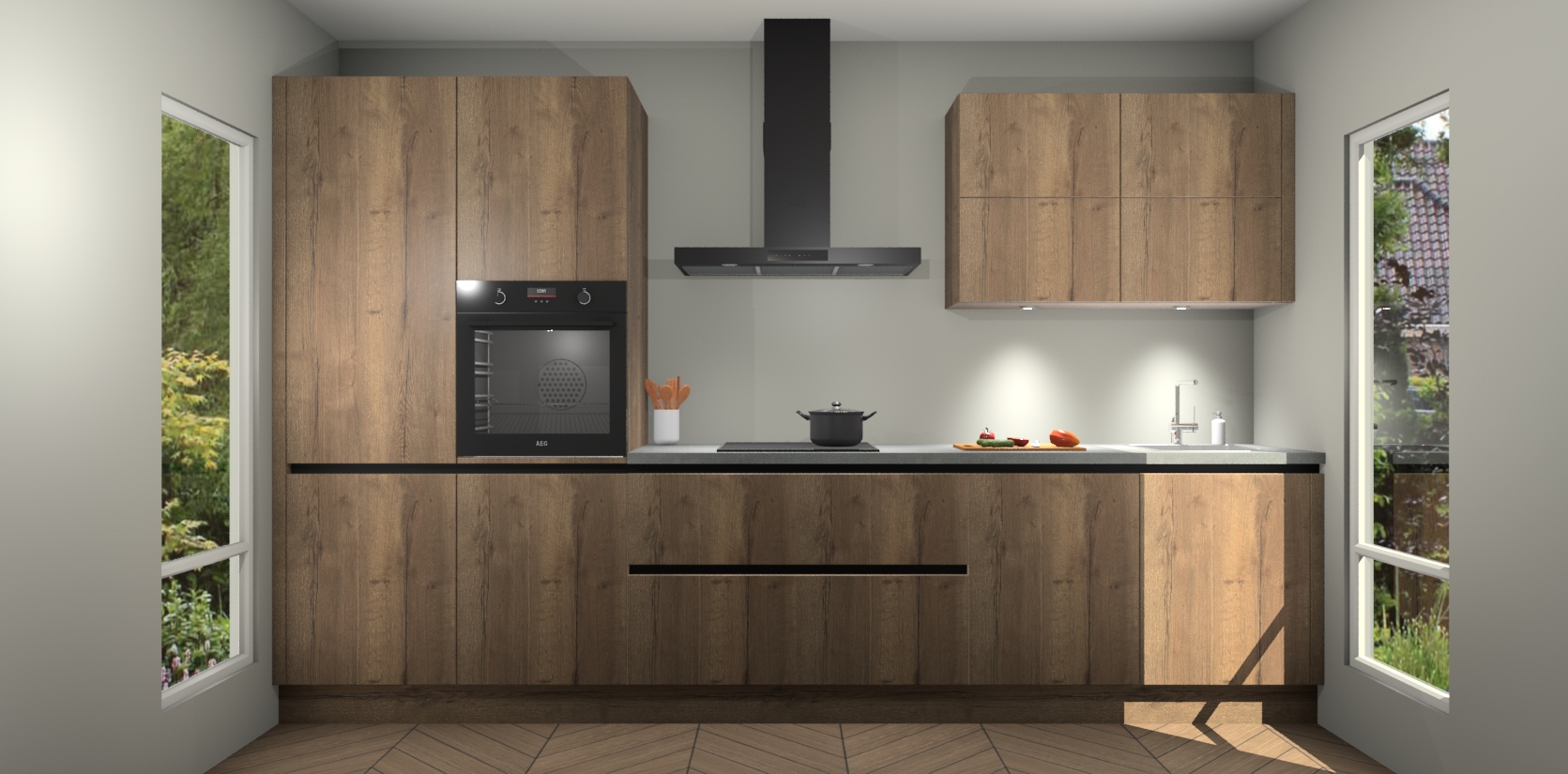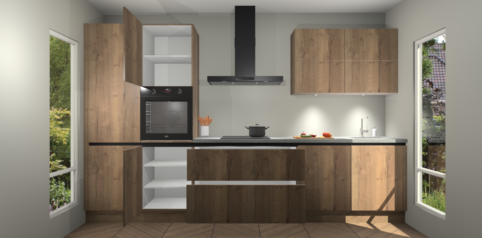 Maak kennis met de nieuwe Chocolade Eiken greeploze Keuken Parijs - de perfecte designcombinatie van gemak, moderne elegantie en ultramodern design. Met een gemakkelijk te reinigen Chocolade Eiken afwerking, zal de slankheid van deze keuken zeker een vleugje luxe toevoegen aan elke ruimte die hij inneemt.