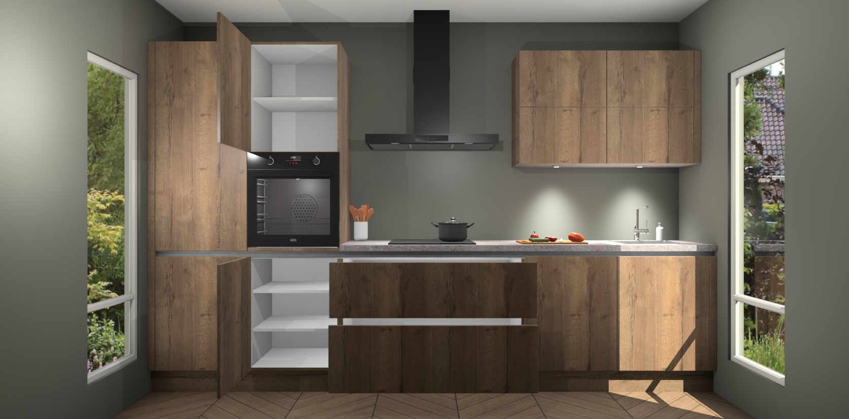 Maak kennis met de nieuwe Chocolade Eiken greeploze Keuken Parijs - de perfecte designcombinatie van gemak, moderne elegantie en ultramodern design. Met een gemakkelijk te reinigen Chocolade Eiken afwerking, zal de slankheid van deze keuken zeker een vleugje luxe toevoegen aan elke ruimte die hij inneemt.