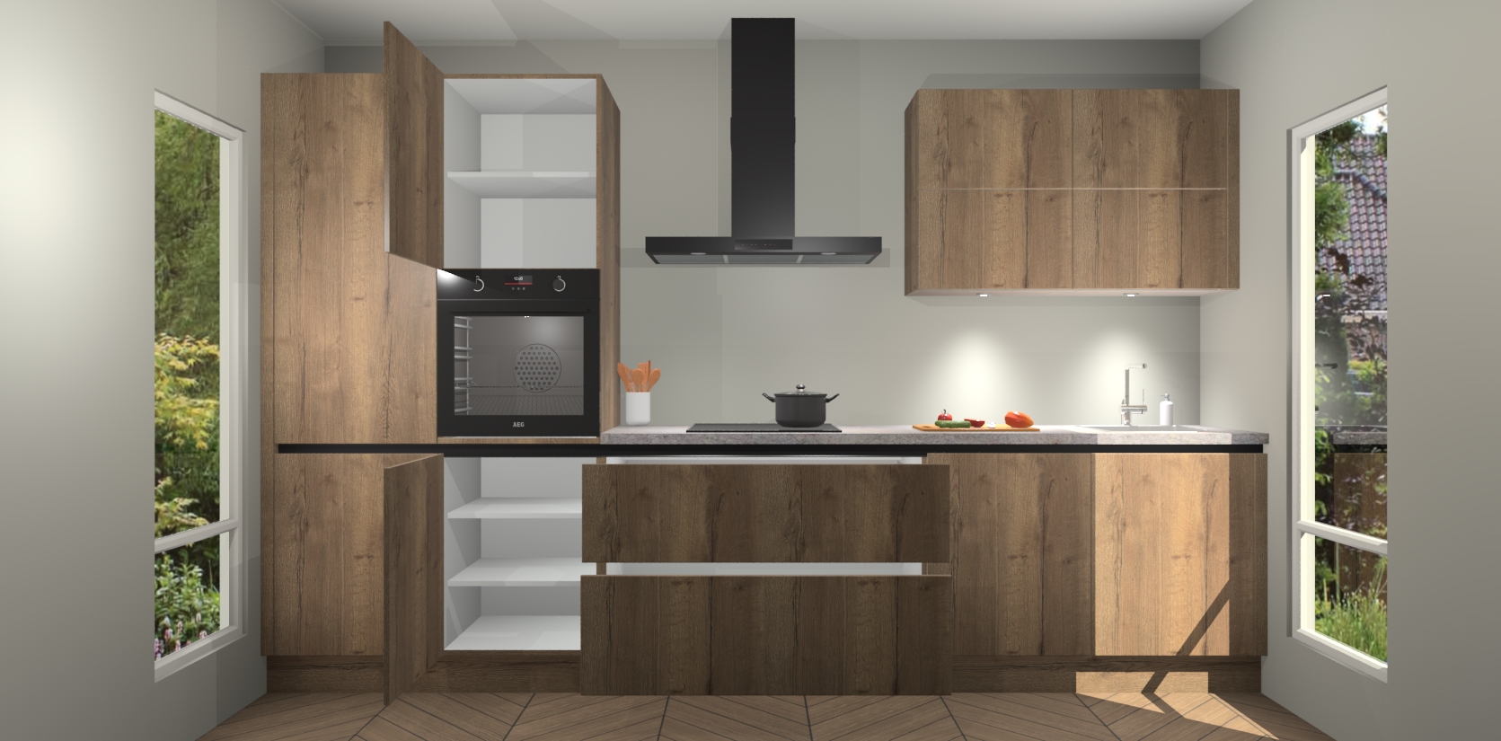 Maak kennis met de nieuwe Chocolade Eiken greeploze Keuken Parijs - de perfecte designcombinatie van gemak, moderne elegantie en ultramodern design. Met een gemakkelijk te reinigen Chocolade Eiken afwerking, zal de slankheid van deze keuken zeker een vleugje luxe toevoegen aan elke ruimte die hij inneemt.